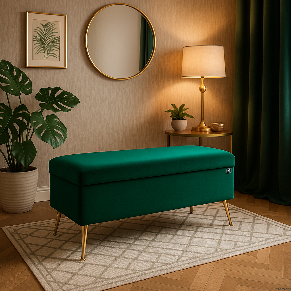 KUFER TAPICEROWANY WELUR PIANO 08 BUTELKOWA ZIELEŃ / Nóżki Złote model QG-1