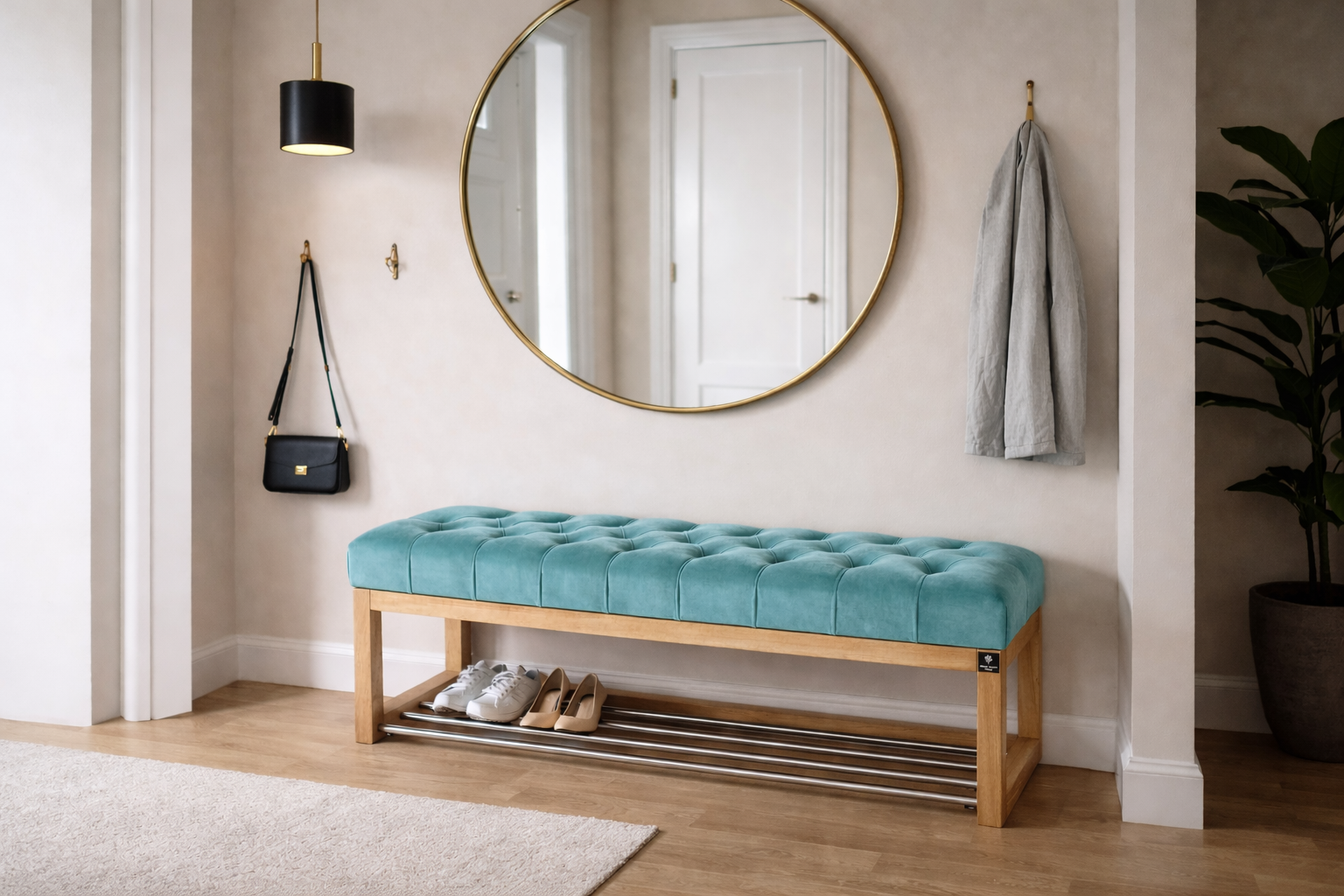 ŁAWKA Z SIEDZISKIEM PIKOWANYM Mięta PIANO 09 / Guzik Tapicerowany w Kolorze Tkaniny / Stelaż Naturalny / model LPP-4