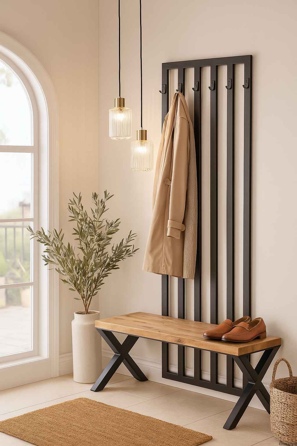 • Ławka industrialna posiada praktyczny wieszak na ubrania
