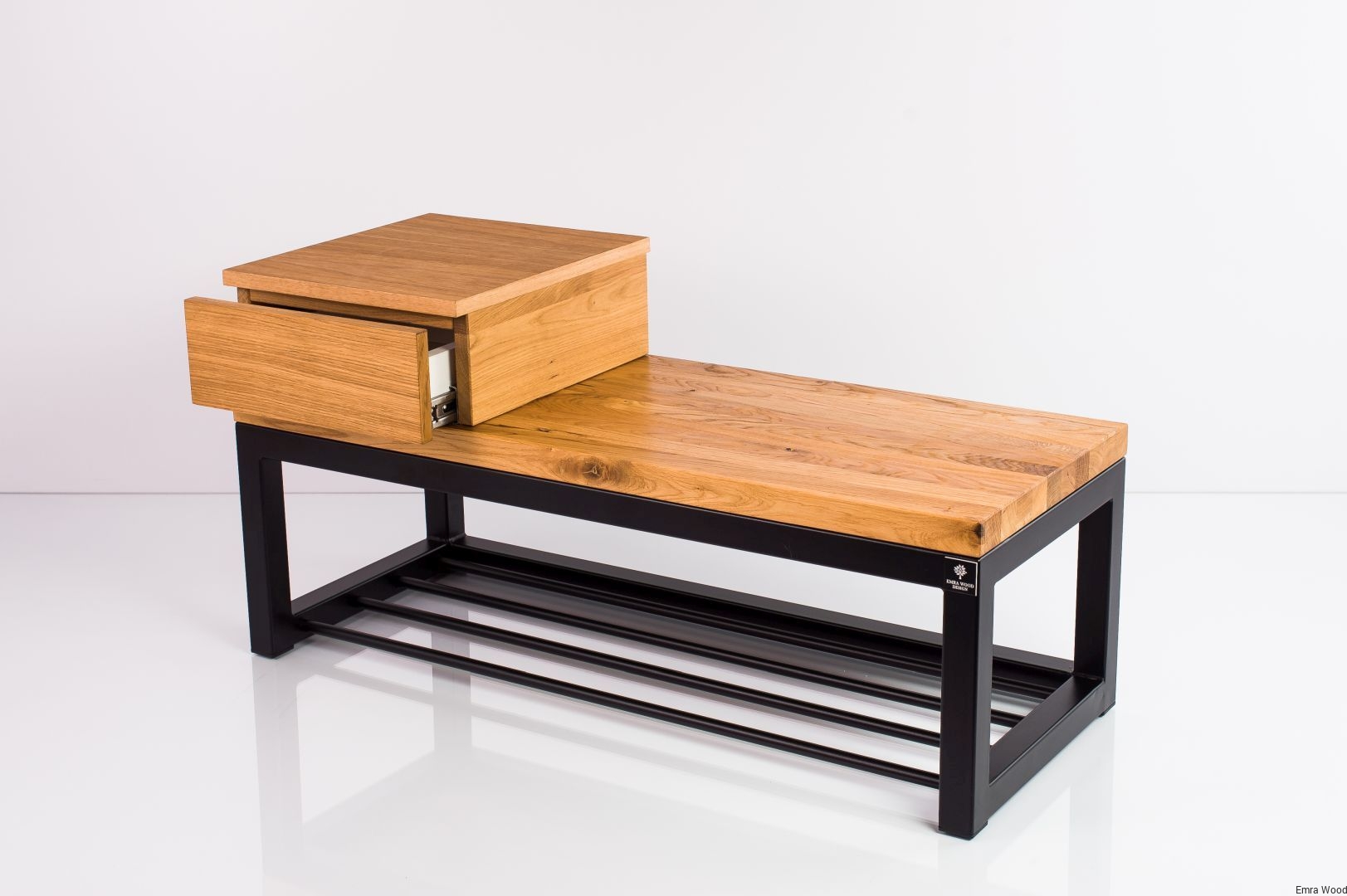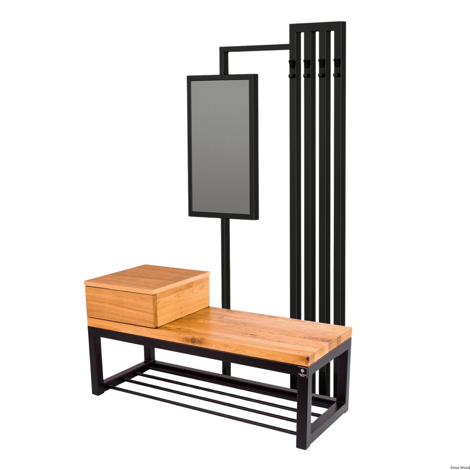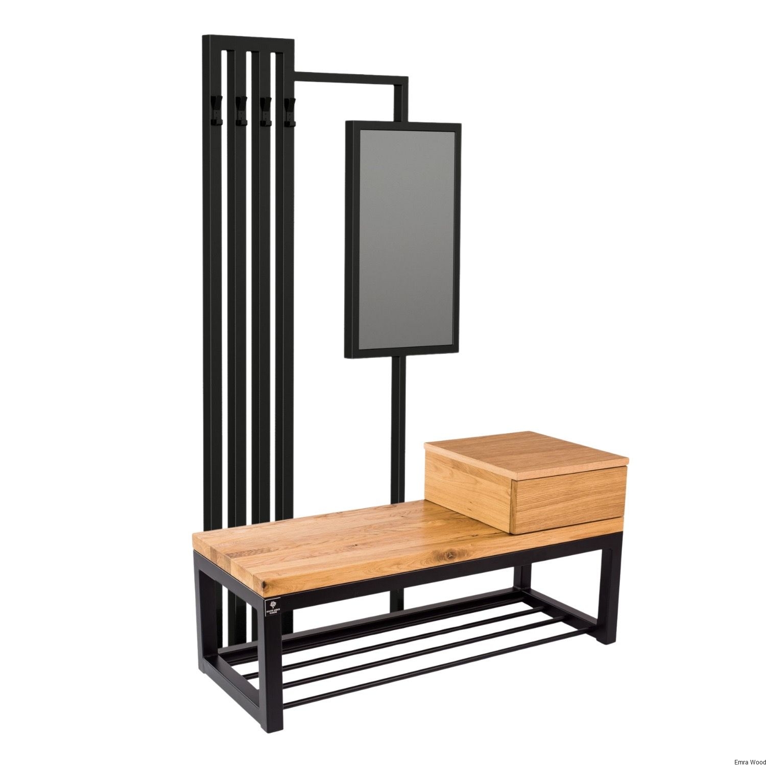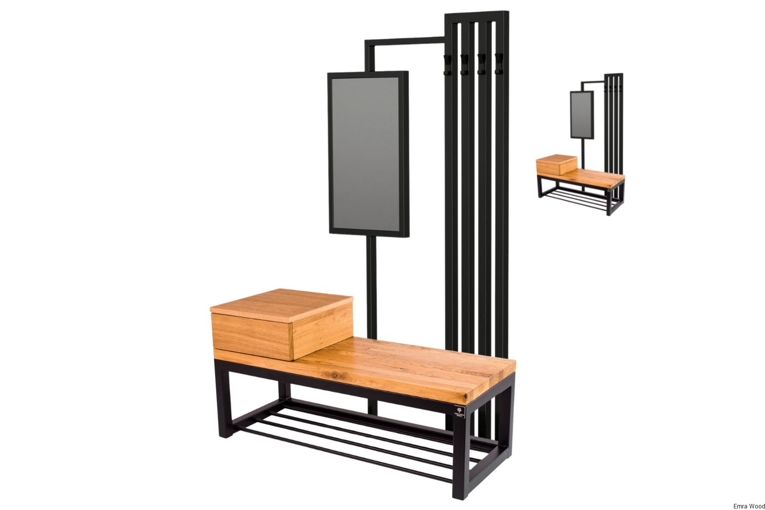 Ławka industrialna posiada praktyczny wieszak na ubrania, lustro oraz szufladkę na różnego rodzaju drobiazgi