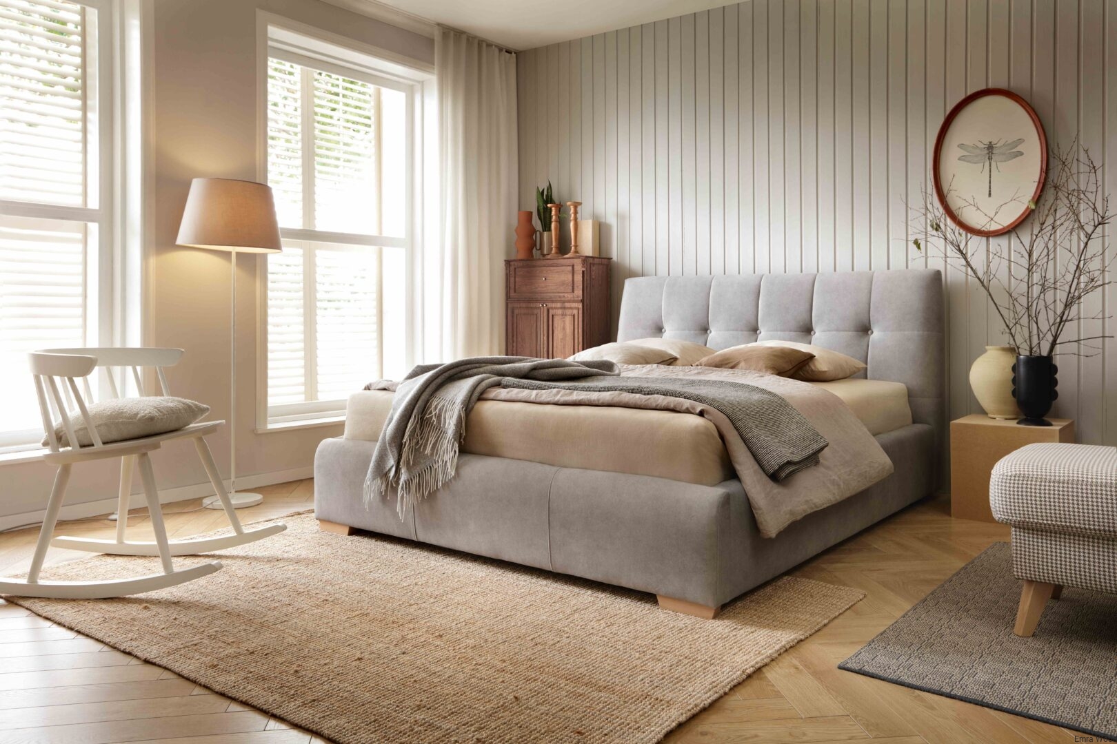 ŁÓŻKO TAPICEROWANE NA NÓŻKACH Z POJEMNIKIEM NA POŚCIEL SENtique 180x200