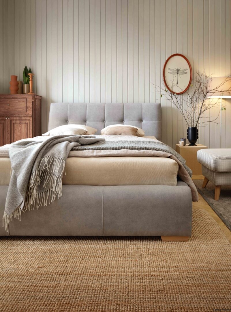 ŁÓŻKO TAPICEROWANE NA NÓŻKACH Z POJEMNIKIEM NA POŚCIEL SENtique 140x200