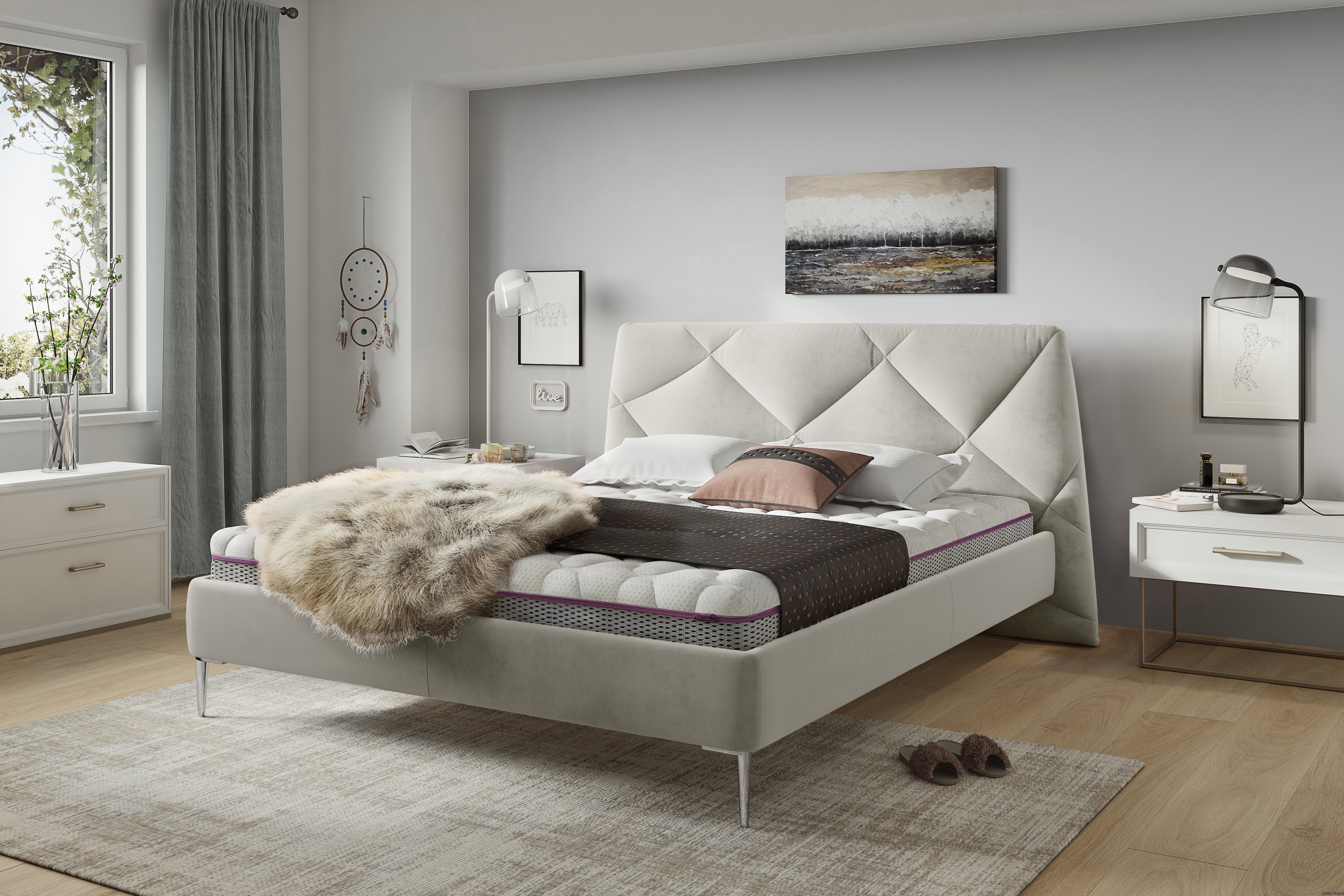 ŁÓŻKO TAPICEROWANE NA NÓŻKACH Z POJEMNIKIEM NA POŚCIEL SENtique 180x200