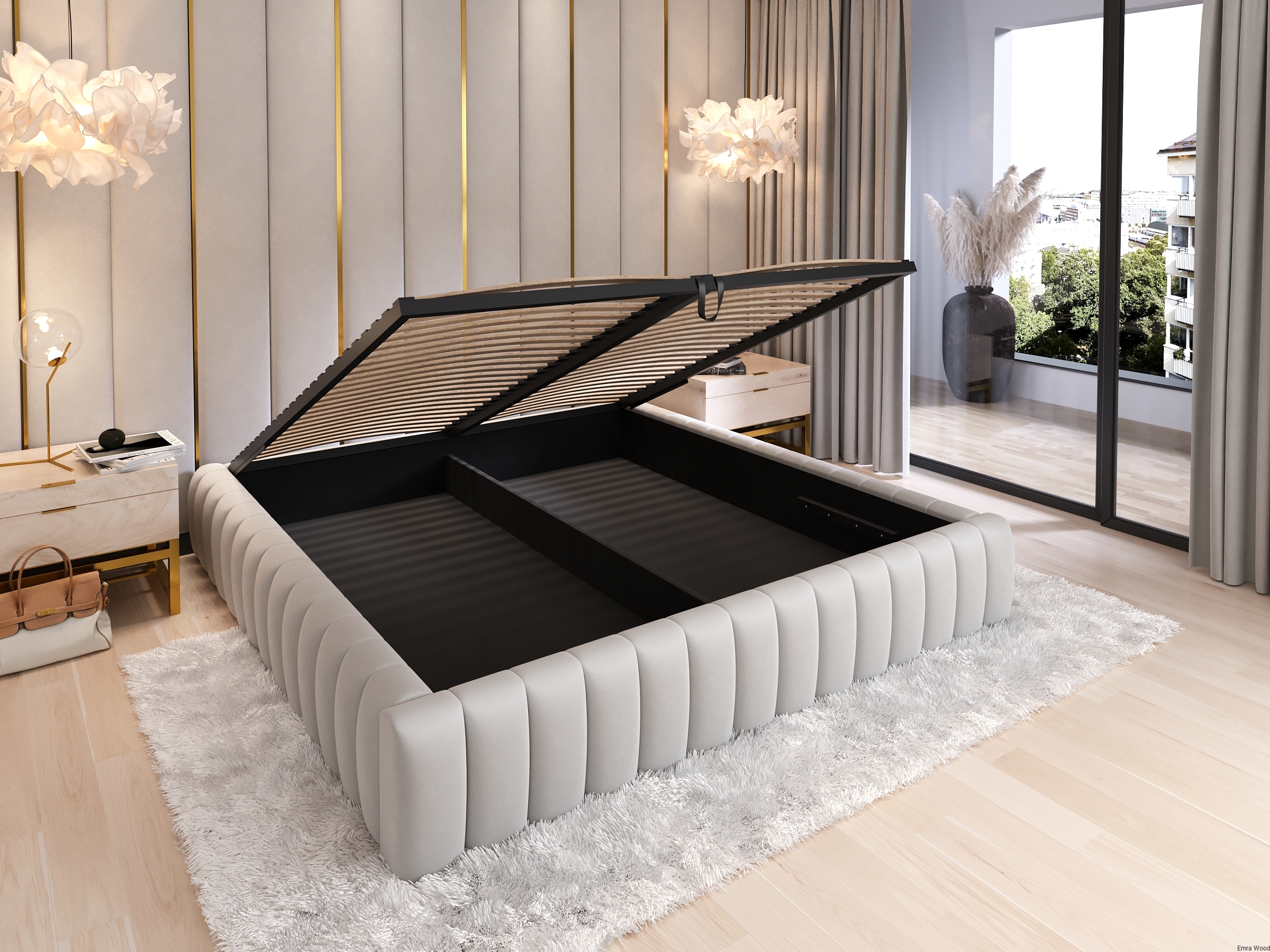 ŁÓŻKO TAPICEROWANE NA NÓŻKACH Z POJEMNIKIEM NA POŚCIEL SENlight 140x200