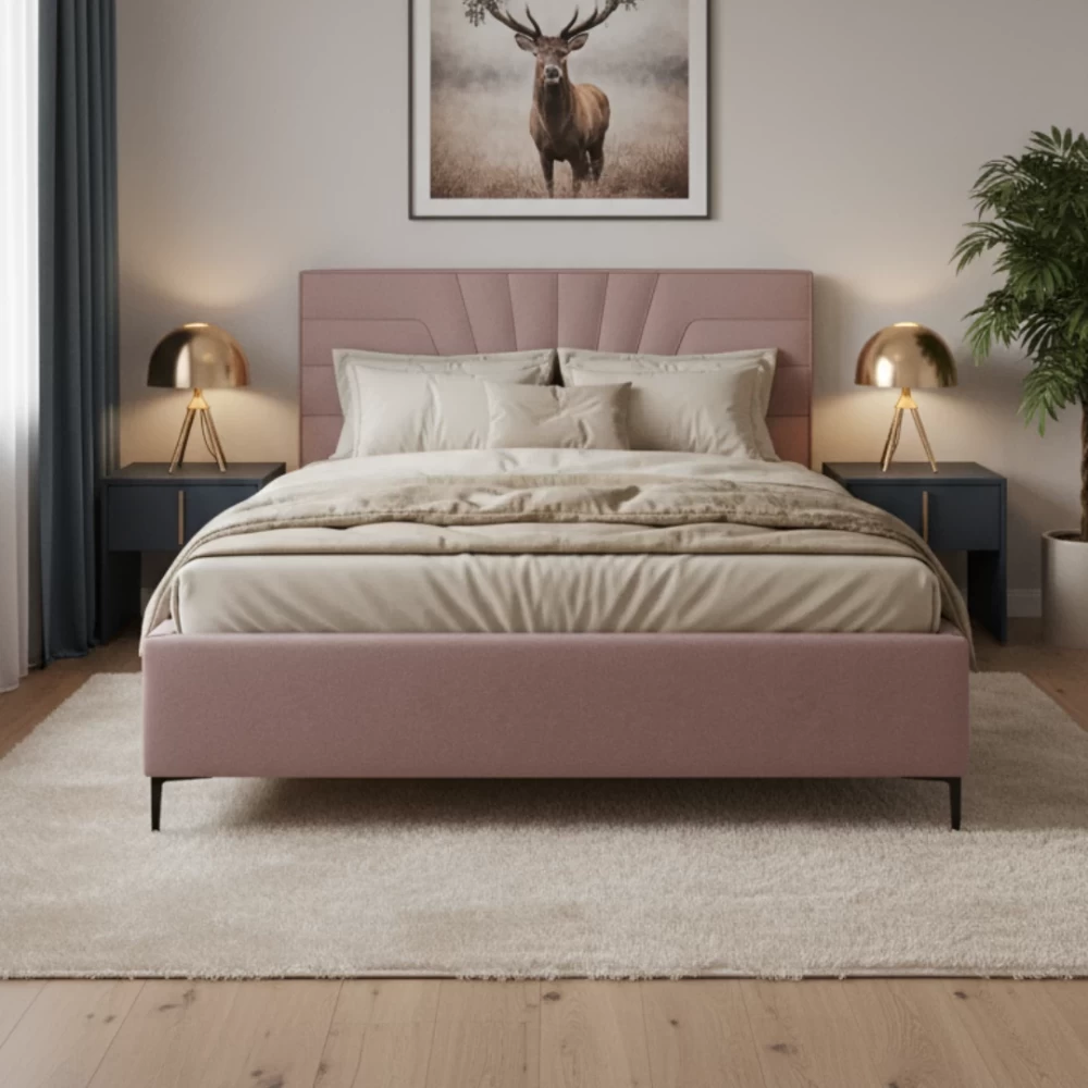 Łóżko tapicerowane na nóżkach, które nadają mu nowoczesnego charakteru, ułatwiają sprzątanie i pozwalają na swobodny wjazd odkurzacza automatycznego, np. robota typu Roomba. Rama łóżka wykonana jest z drewna, co gwarantuje trwałość oraz bezpieczeństwo użytkowania. Dodatkowo łóżko posiada pojemnik na pościel, ułatwiający utrzymanie porządku w sypialni. Elastyczny stelaż ze sprężynującymi listwami zapewnia doskonałe podparcie materaca i komfortowy sen. Całość powstaje w Polsce, co gwarantuje wysoką jakość wykonania i dbałość o detale. Produkt sprzedawany jest bez materaca, dając możliwość dopasowania idealnego modelu zgodnie z własnymi preferencjami.
