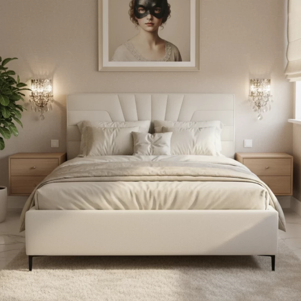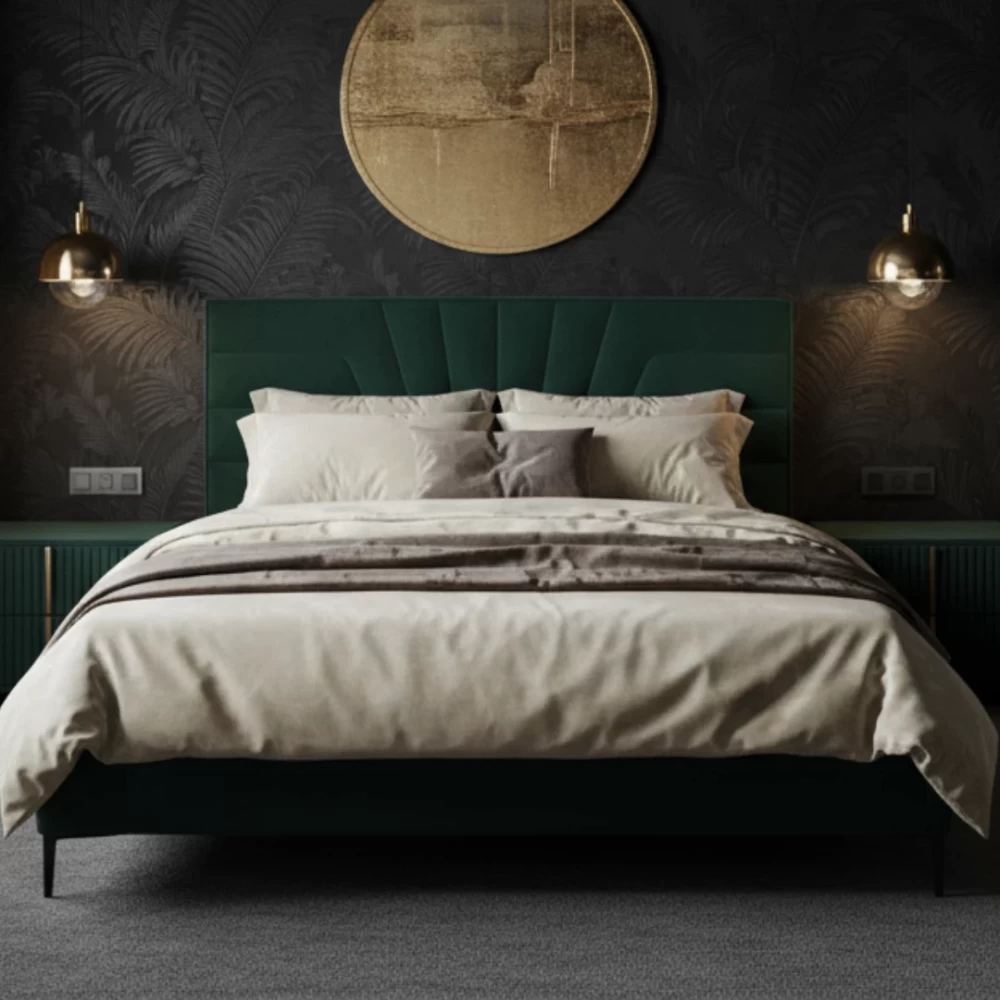 Łóżko tapicerowane na nóżkach, które nadają mu nowoczesnego charakteru, ułatwiają sprzątanie i pozwalają na swobodny wjazd odkurzacza automatycznego, np. robota typu Roomba. Rama łóżka wykonana jest z drewna, co gwarantuje trwałość oraz bezpieczeństwo użytkowania. Dodatkowo łóżko posiada pojemnik na pościel, ułatwiający utrzymanie porządku w sypialni. Elastyczny stelaż ze sprężynującymi listwami zapewnia doskonałe podparcie materaca i komfortowy sen. Całość powstaje w Polsce, co gwarantuje wysoką jakość wykonania i dbałość o detale. Produkt sprzedawany jest bez materaca, dając możliwość dopasowania idealnego modelu zgodnie z własnymi preferencjami.
