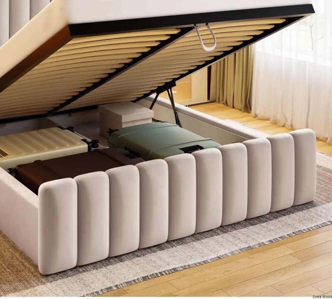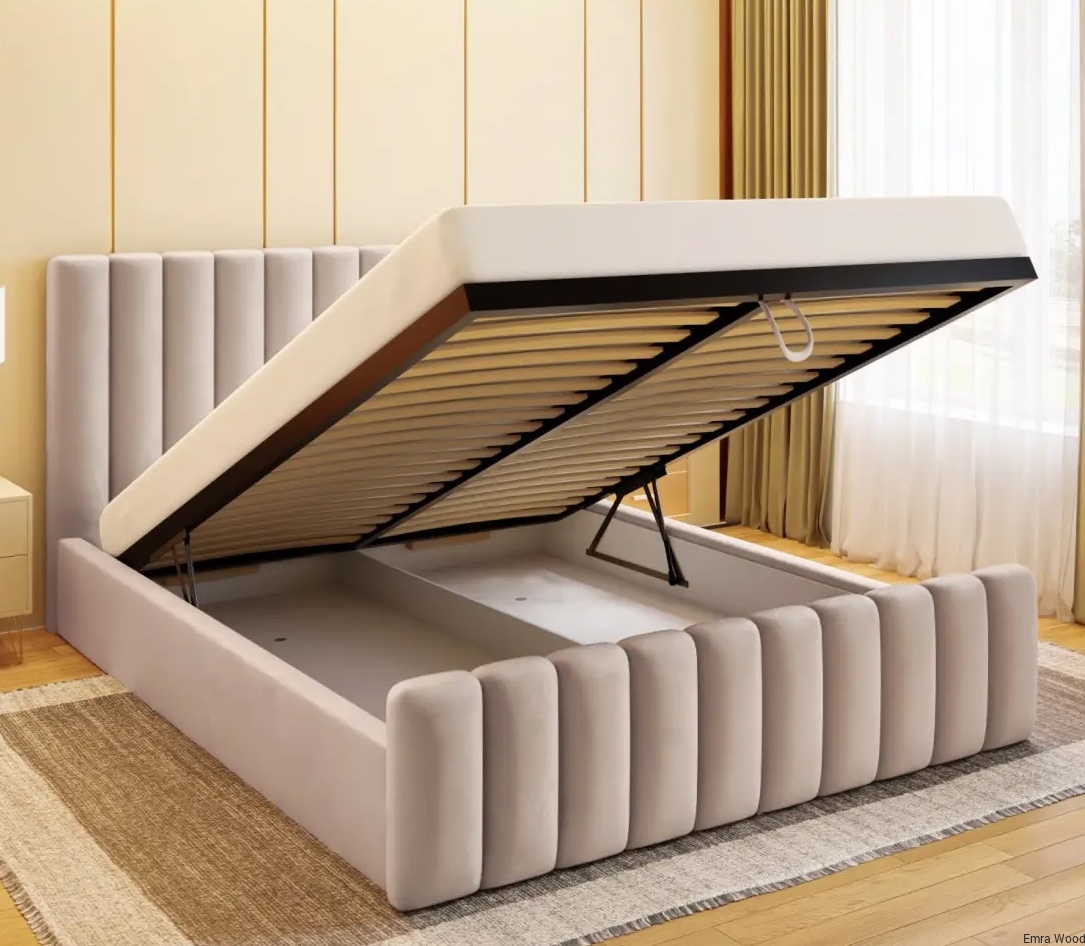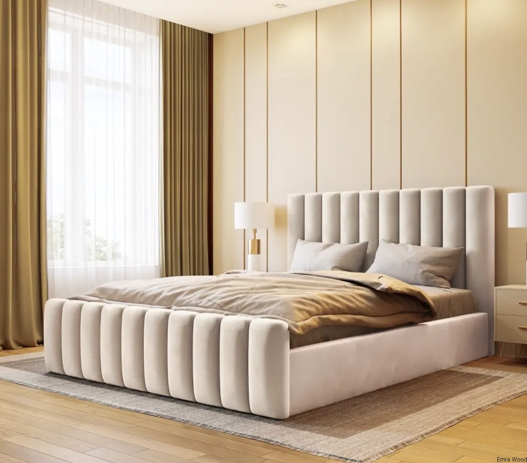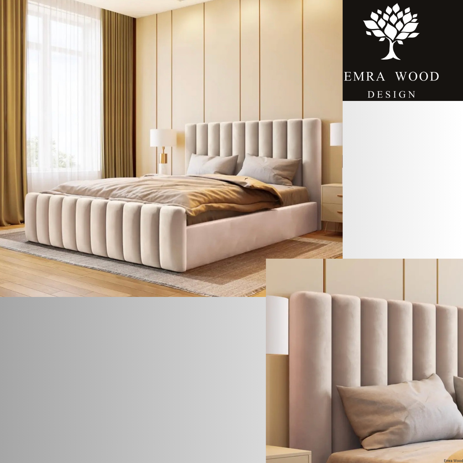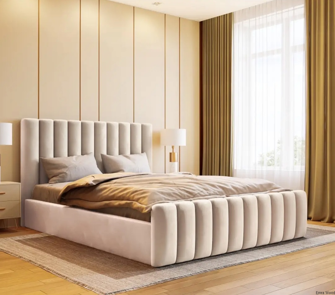 Łóżko Frida w pionowe pasy z podwyższonym zanóżkiem, który jest o 10cm wyższy niż boki łóżka.