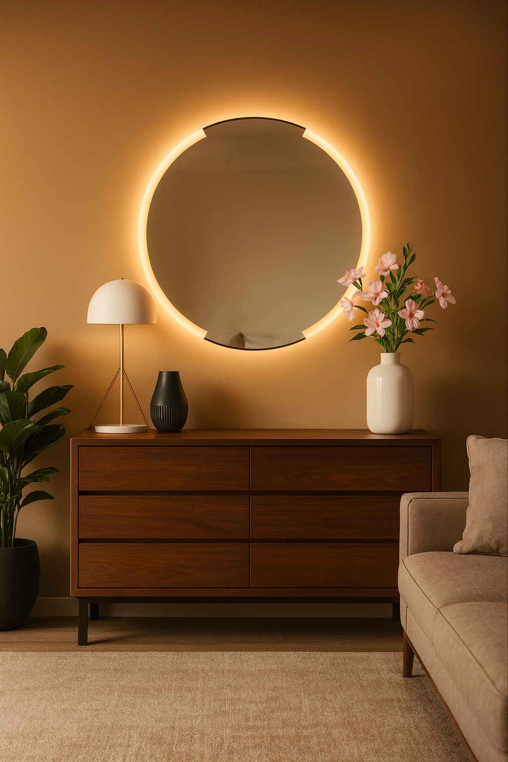 Lustro PIPPI LED — okrągłe z organicznie ściętym bokiem i subtelnym podświetleniem