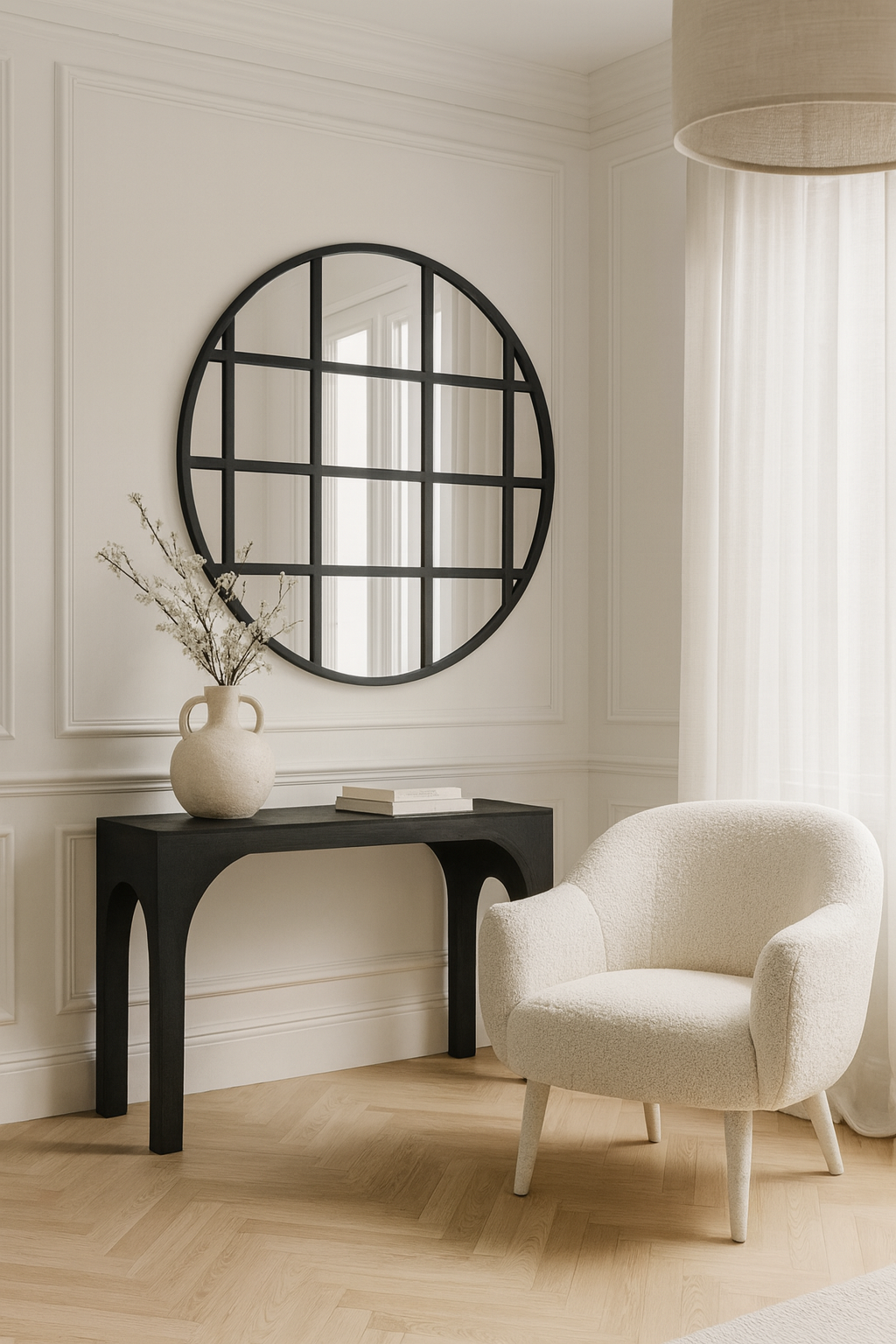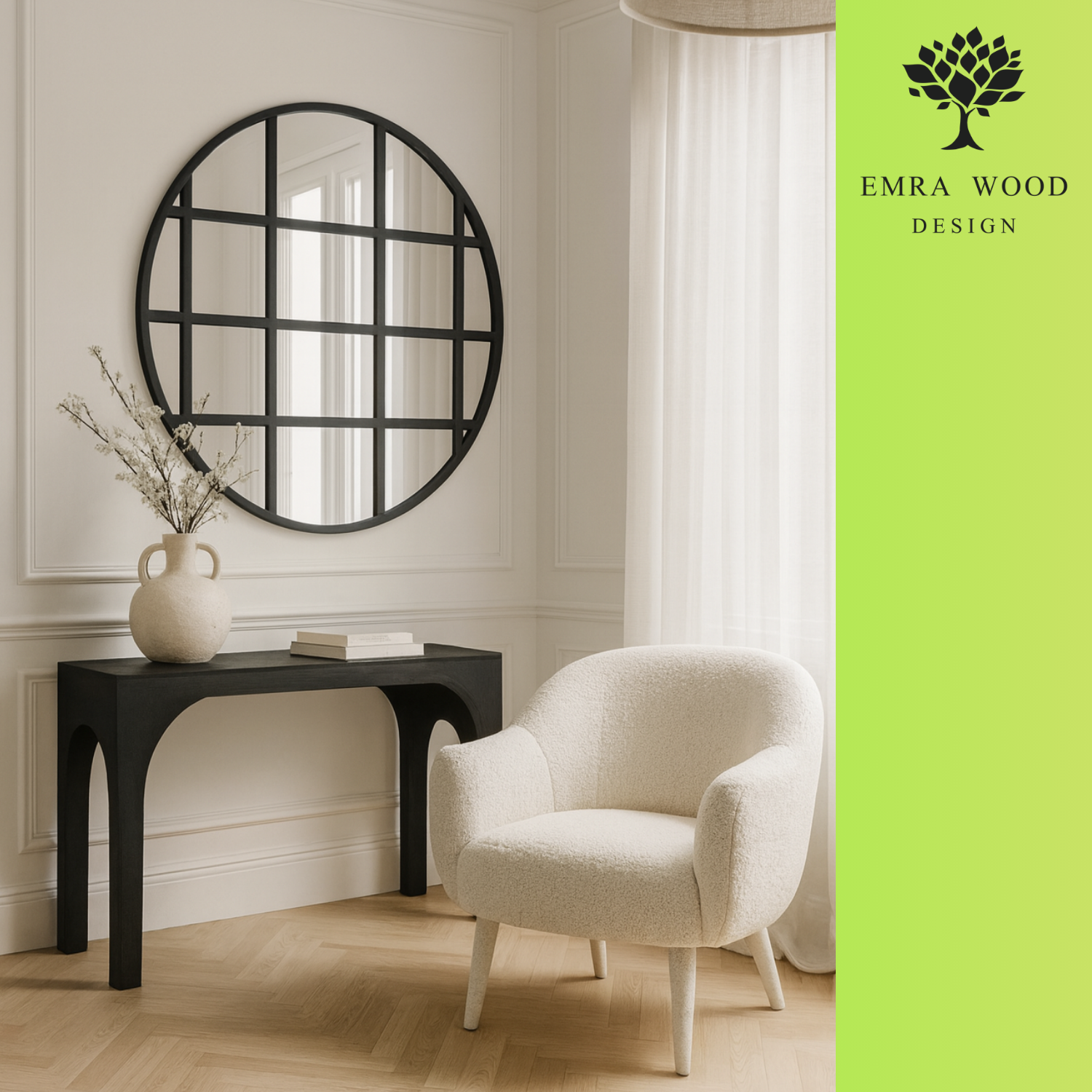 Strona główna » Nowość » Lustro MANHATTAN – designerskie okrągłe lustro loftowe ze szprosami w czarnej ramie, idealne do salonu, sypialni i biura