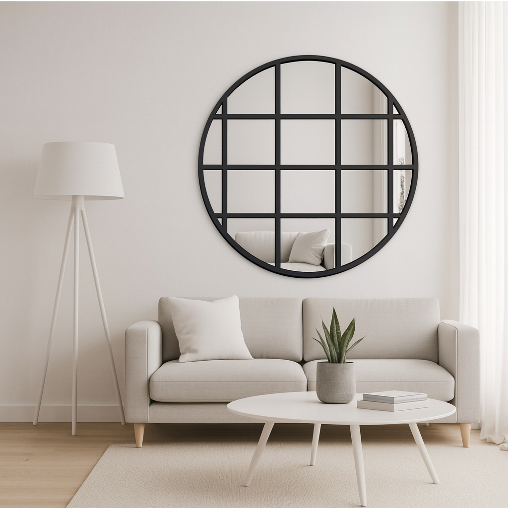 Lustro MANHATTAN – designerskie okrągłe lustro loftowe ze szprosami w czarnej ramie, idealne do salonu, sypialni i biura