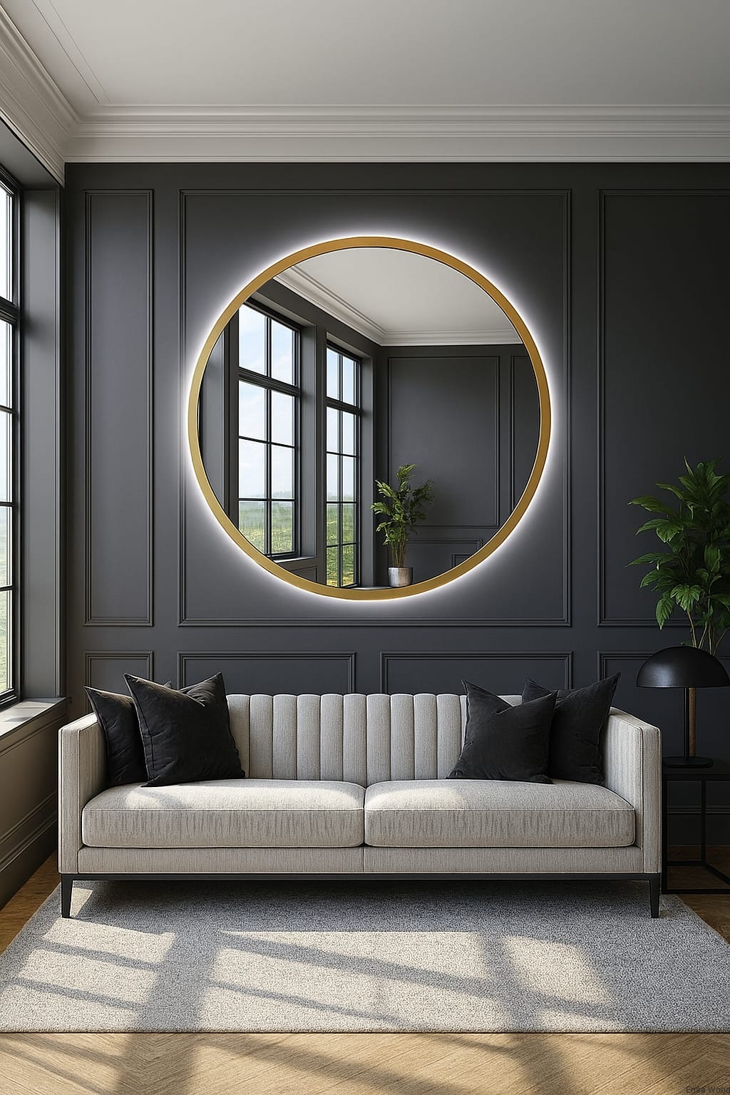 Lustro AURA RING – okrągłe lustro LED z podświetleniem w czarnej ramie | Nowoczesne lustra do łazienki, przedpokoju i salonu