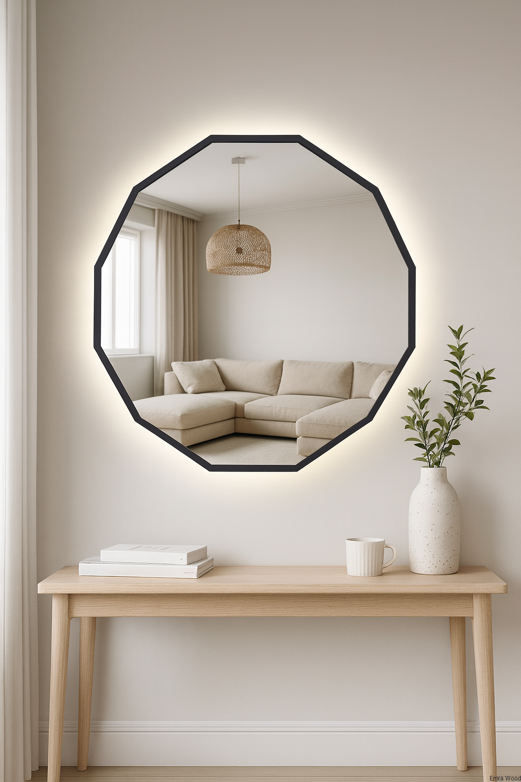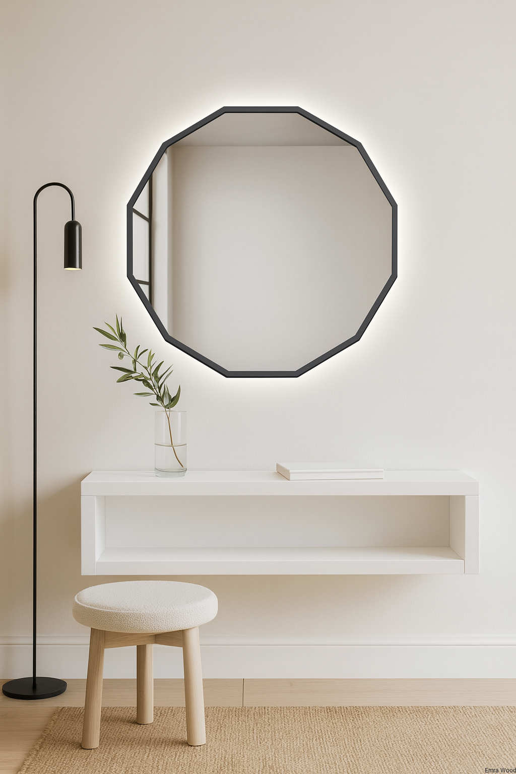 Lustro NÉROLI – nowoczesne lustro wielokątne LED z podświetleniem w czarnej ramie MDF | designerskie lustro dekoracyjne do salonu, sypialni, łazienki,