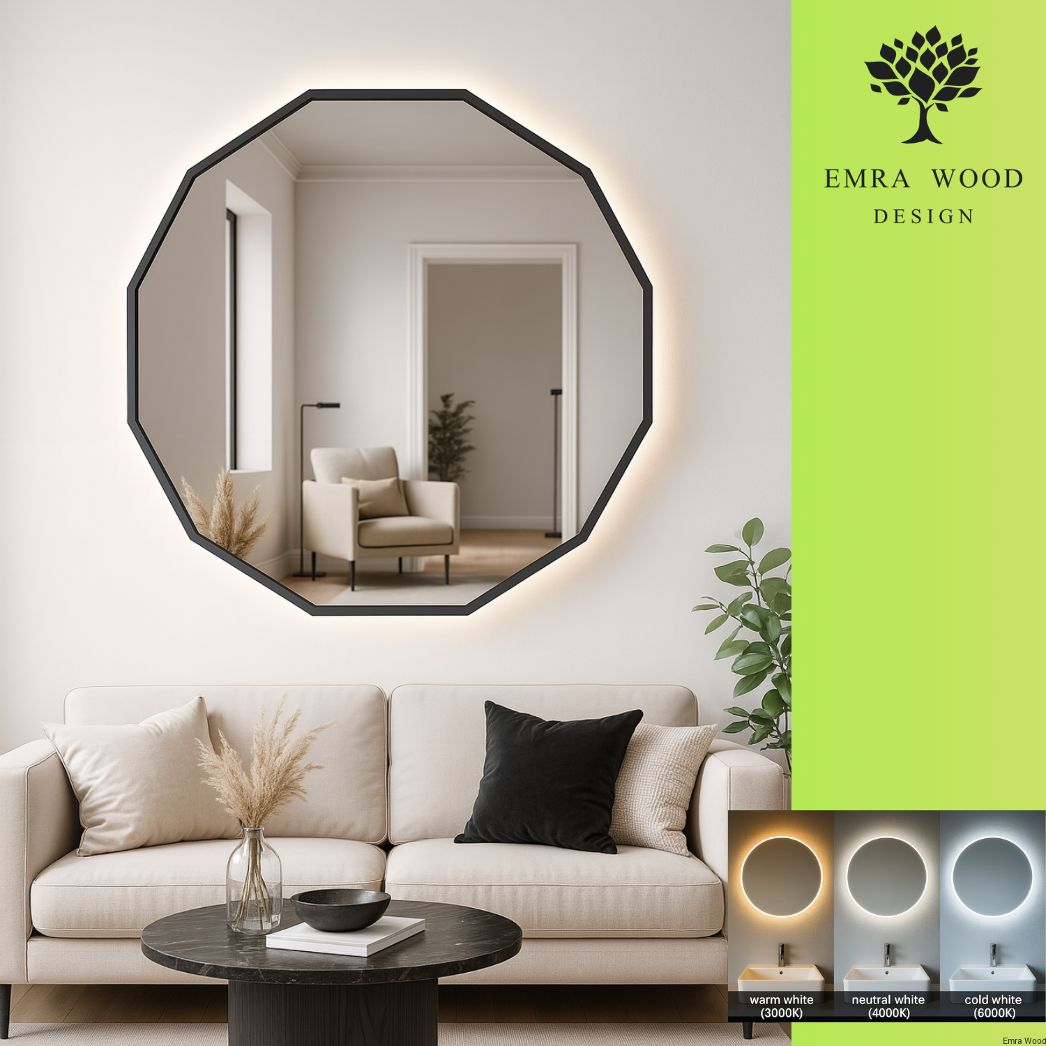 Dodatkowym atutem jest wbudowane oświetlenie LED, które podkreśla formę lustra i tworzy wyjątkowy klimat w pomieszczeniu. Możesz samodzielnie wybrać barwę światła (ciepłą, neutralną lub zimną), dopasowując ją do swoich potrzeb i stylu wnętrza.
