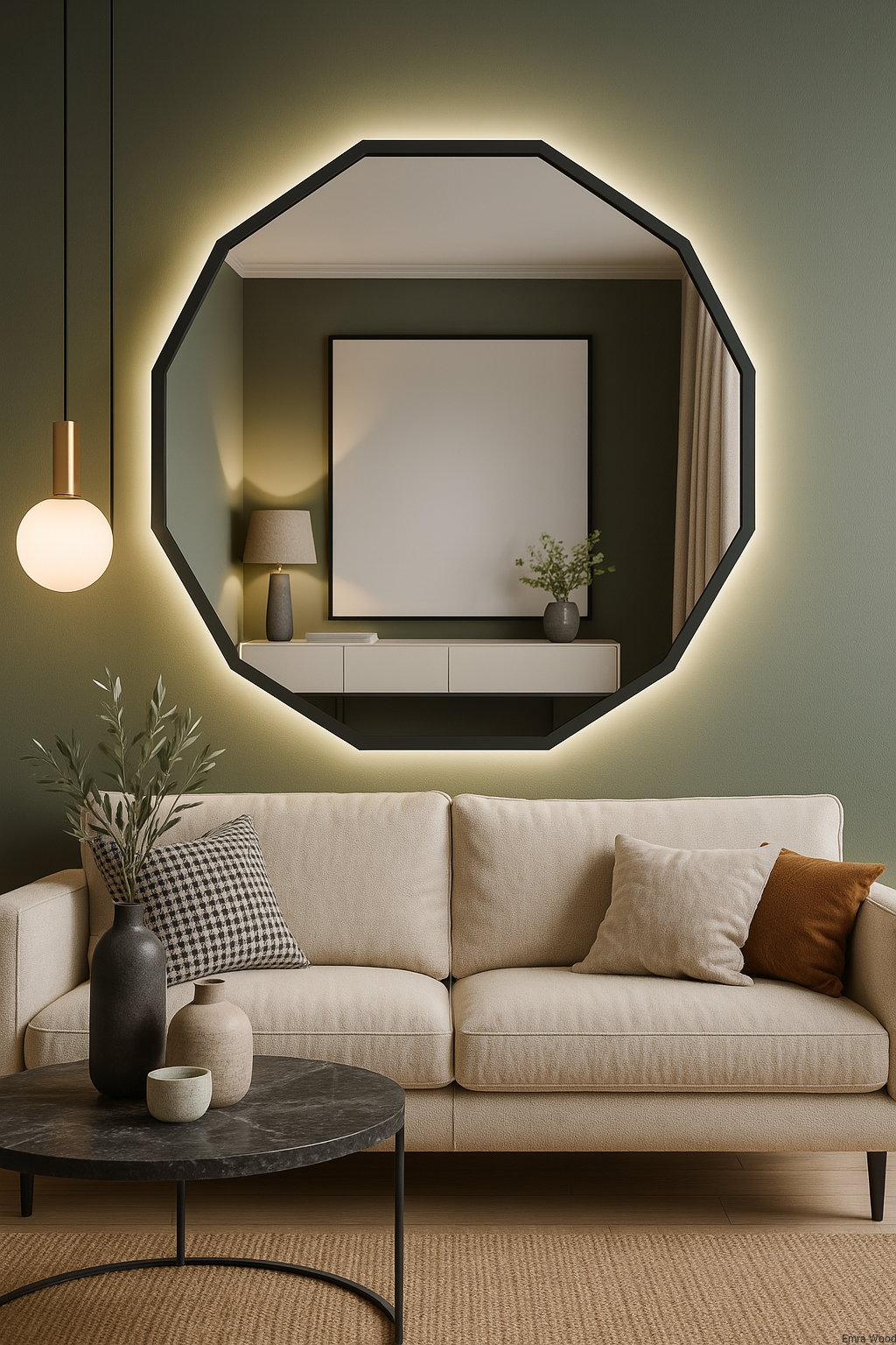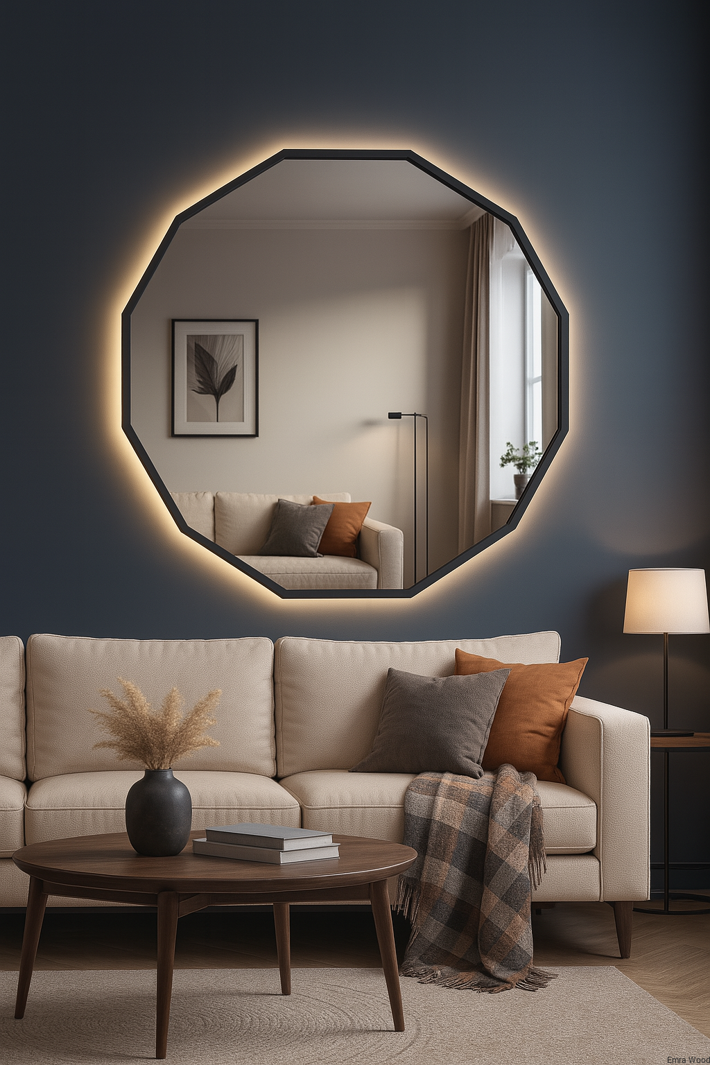 Dodatkowym atutem jest wbudowane oświetlenie LED, które podkreśla formę lustra i tworzy wyjątkowy klimat w pomieszczeniu. Możesz samodzielnie wybrać barwę światła (ciepłą, neutralną lub zimną), dopasowując ją do swoich potrzeb i stylu wnętrza.