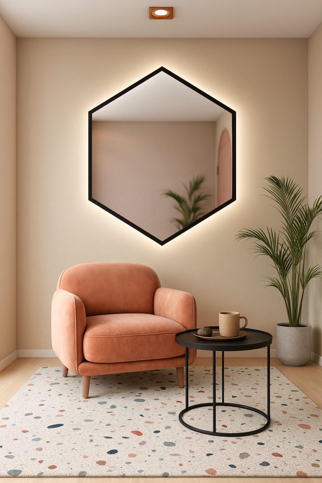 Lustro o geometrycznym kształcie w ramie z podświetleniem – HEXA W RAMIE LED