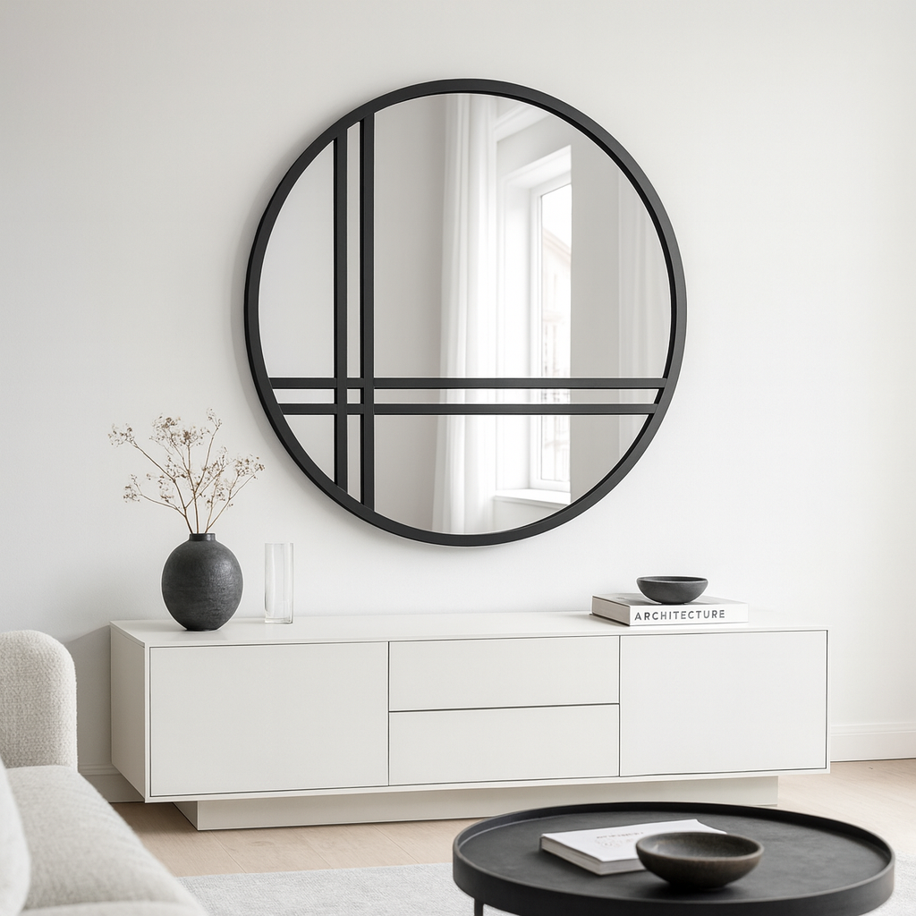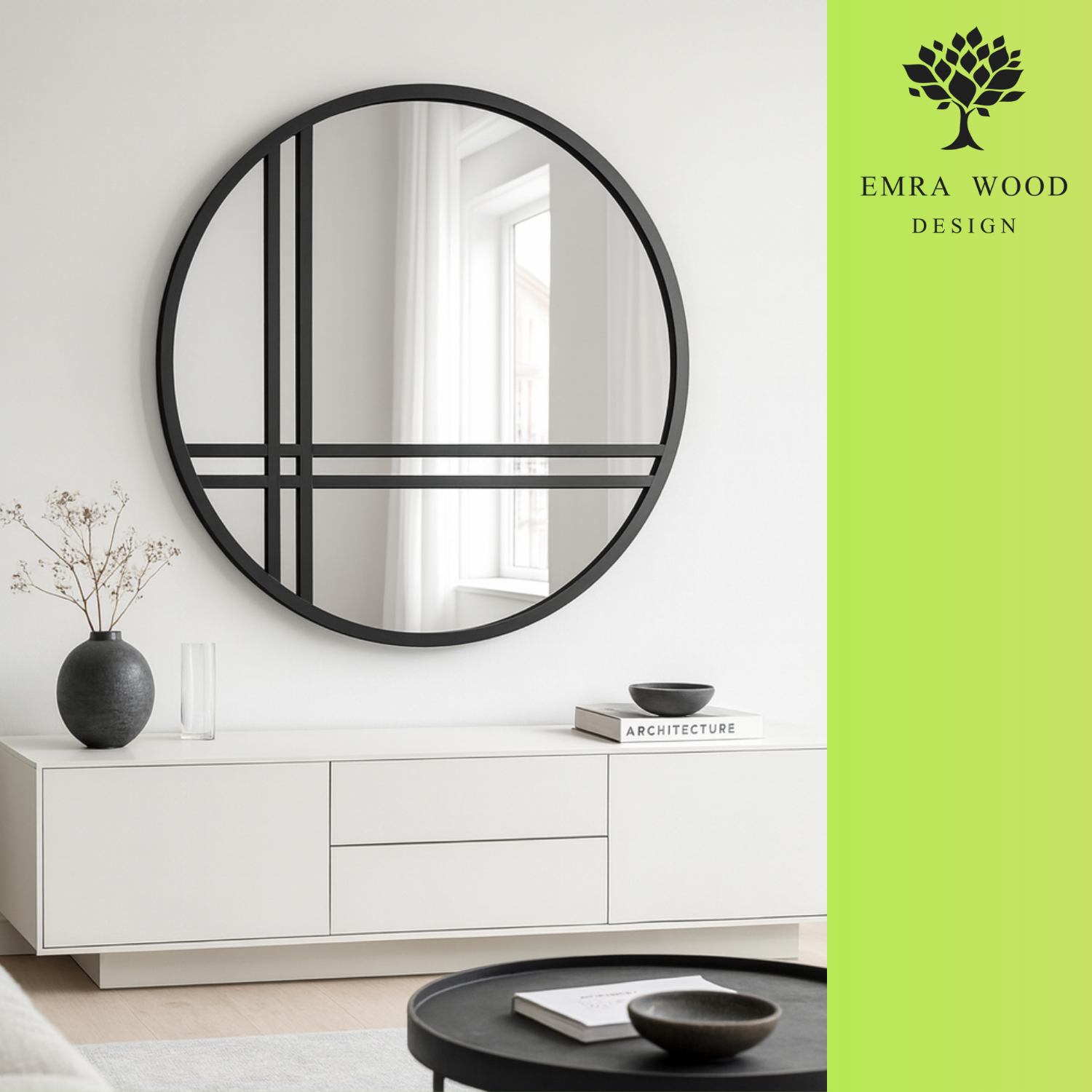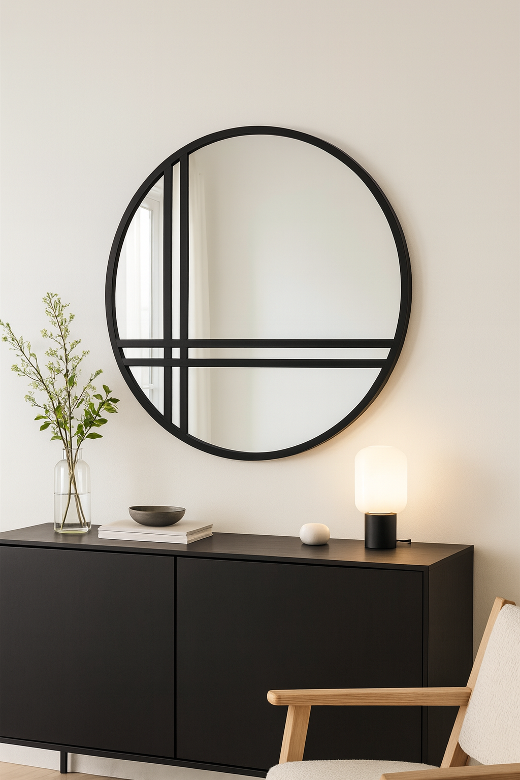Lustro MANHATTAN  – designerskie okrągłe lustro loftowe ze szprosami w czarnej ramie, idealne do salonu, sypialni i biura
