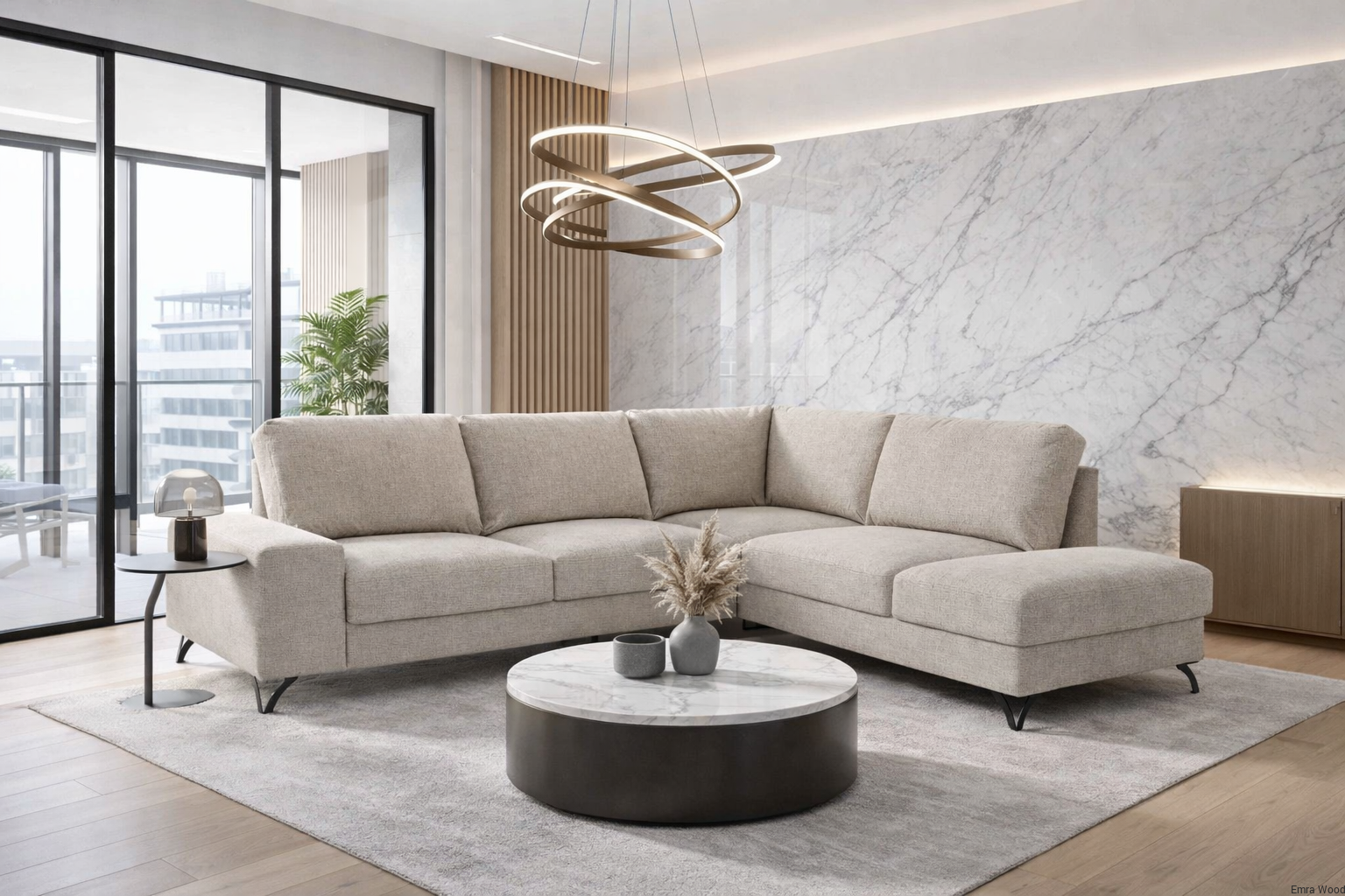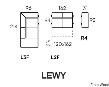 Wielofunkcyjny mebel modułowy w klasycznym stylu, wyróżniający się „miękką” formą. Zaprezentowany w formie tzw. zamkniętej, która oferuje następujące zestawienie modułów: szeroki podłokietnik, sofa dwuosobowa z funkcją spania oraz otomana z oparciem i dużym pojemnikiem na pościel.