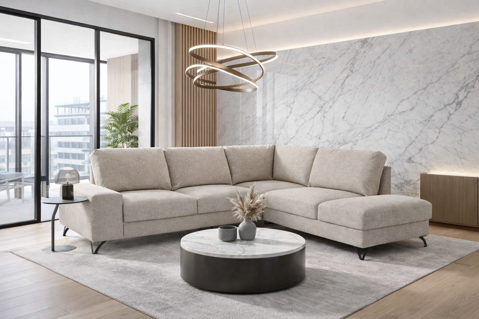 Wielofunkcyjny mebel modułowy w klasycznym stylu, wyróżniający się „miękką” formą. Zaprezentowany w formie tzw. zamkniętej, która oferuje następujące zestawienie modułów: szeroki podłokietnik, sofa dwuosobowa z funkcją spania oraz otomana z oparciem i dużym pojemnikiem na pościel.
