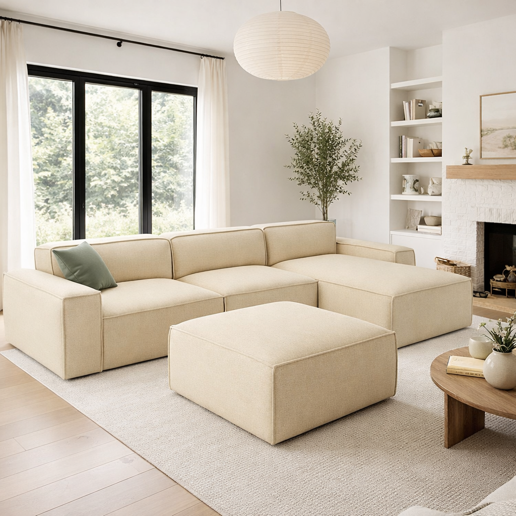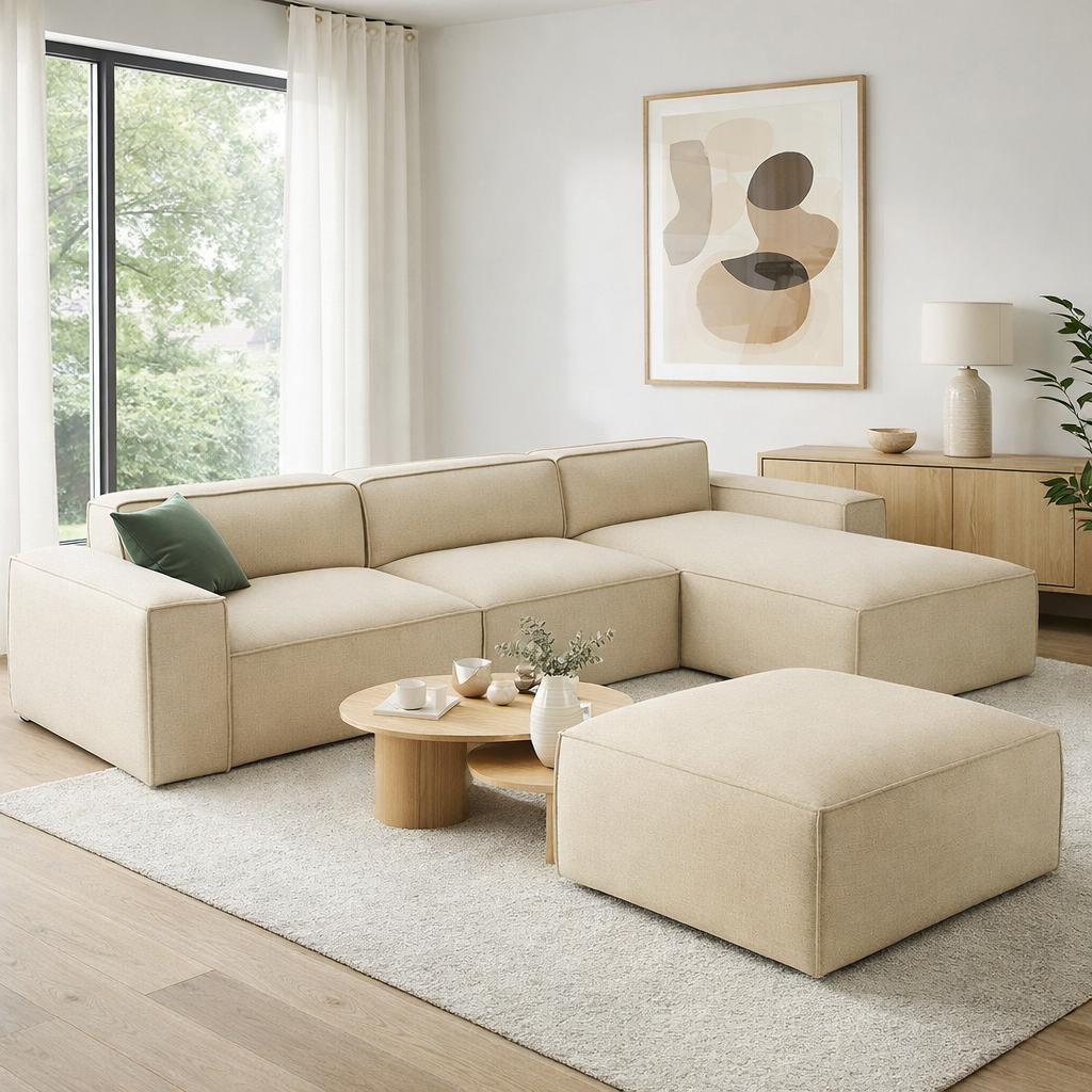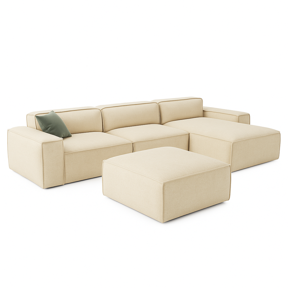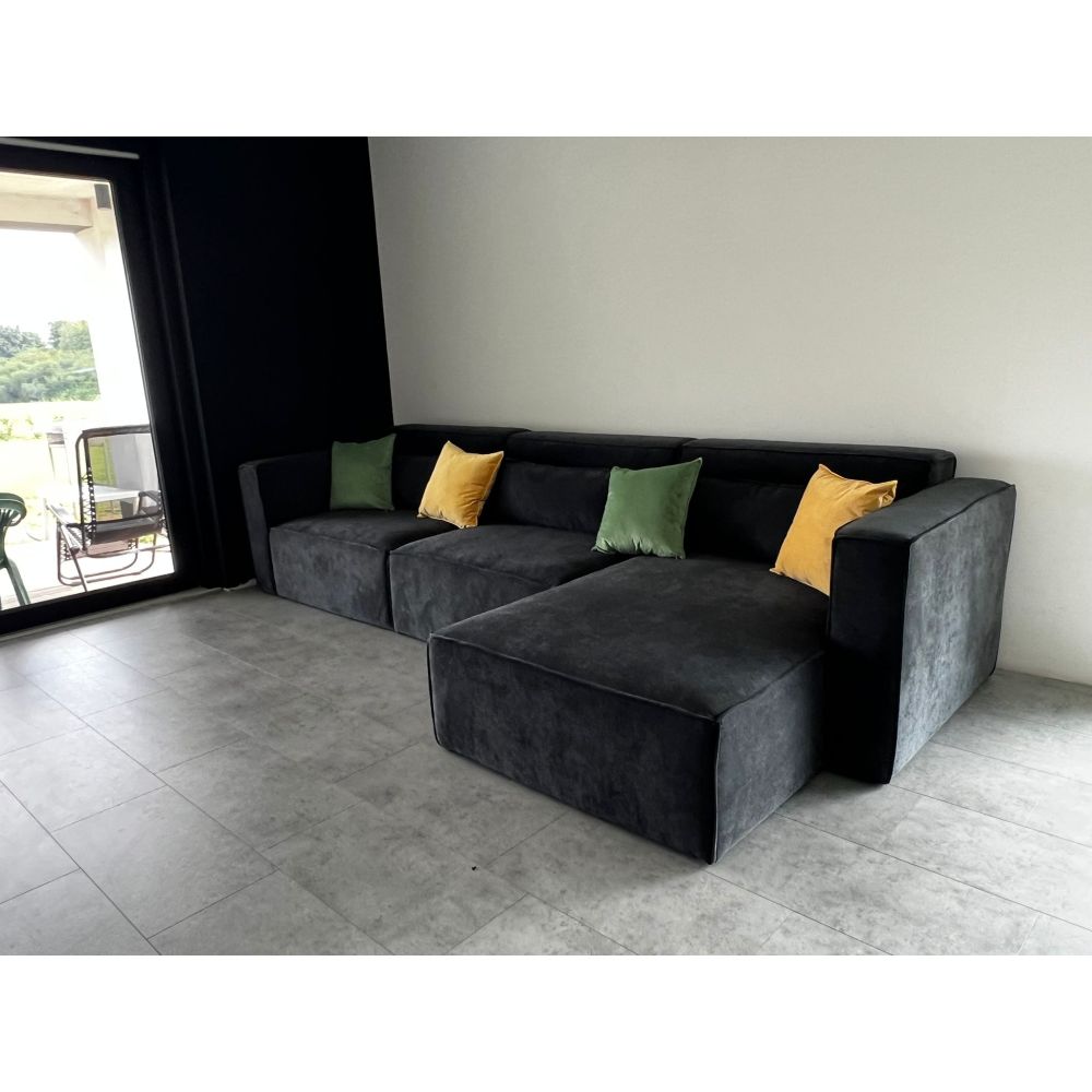Modułowa budowa: Narożnik składa się z miękkich, komfortowych modułów, leżanki oraz dwóch puf, które można swobodnie przestawiać, tworząc różnorodne układy dopasowane do Twoich potrzeb.