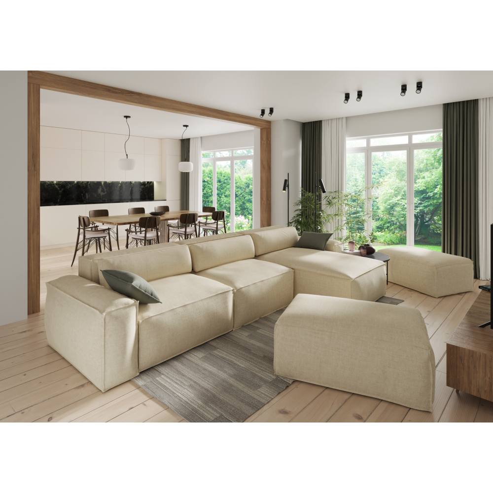 Przenieś swoje wnętrze na wyższy poziom komfortu i elegancji z naszym narożnikiem modułowym z dwoma pufkami. Ta wszechstronna i stylowa sofa została stworzona z myślą o tych, którzy cenią sobie nowoczesny design i najwyższą jakość wykonania. Idealnie dopasowuje się do każdej przestrzeni, oferując nieskończone możliwości aranżacji.