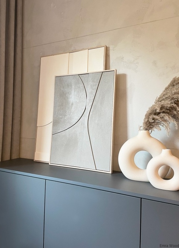 Płynne, organiczne linie, wykonane z lekkiej płyty piankowej, tworzą fascynujący efekt ruchu i przestrzeni. Te dynamiczne kształty przyciągają wzrok i wzbogacają estetykę dzieła. Całość jest oprawiona w elegancką, wąską ramę z polistyrenu, która imituje bielone drewno, doskonale komponując się z naturalnym odcieniem vintage khaki.