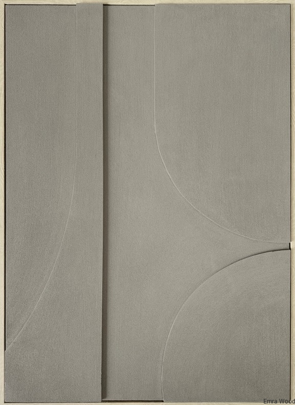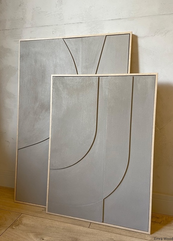 Geometryczne formy, wykonane z lekkiej płyty piankowej, tworzą wyraziste linie i łuki, które przyciągają wzrok i wprowadzają element dynamiki. Całość jest oprawiona w wąską ramę z polistyrenu, imitującą bielone drewno, co doskonale komponuje się z naturalną paletą kolorystyczną reliefu.