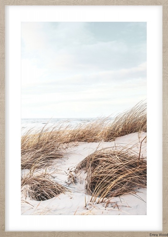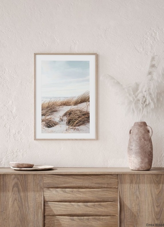 Ten uroczy obraz w ramie w kolorze jasnego drewna przedstawia piękny widok na nadmorskie wydmy poruszane przez silny wiatr z morską bryzą. Grafika oddaje naturalne piękno krajobrazu, w którego oddali widać piękne wzburzone morze. Całość zachowana jest w subtelnej kolorystyce, co czyni ją idealnym uzupełnieniem wnętrz w stylu boho, z naturalnymi dodatkami dekoracyjnymi.Obraz ten będzie pięknym dodatkiem do każdego domu, ale także idealnym uzupełnieniem wnętrz hotelowych, kurortowych czy restauracyjnych znajdujących się w bliskiej lokalizacji morza. Wysoka jakość wykonania i piękna oprawa sprawiają, że obraz ten będzie wspaniałą ozdobą dla każdego miłośnika natury i krajobrazów morskich. Do Obrazu coastal dunes no.1 dobierz również Obraz coastal dunes no.2 i stwórz morską galerię ścienną.
