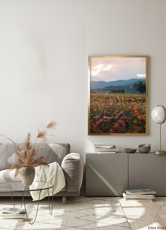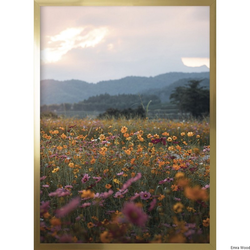Na pierwszym planie piękna łąka kwietna, obszerna, wypełniająca połowę zdjęcia. Widoczne kwiaty w kolorach: pomarańczowy, fioletowy, czerwony, widoczna trawa. Dalej, na horyzoncie wzniesienia, sąsiadujące z niebem w kolorach – różowy, jasnoniebieski i biały. Harmonijne zdjęcie, wyciszające z pięknym widokiem na polną roślinność. Dobrze będzie się prezentować w hotelu i restauracji. Sprawdzi się w salonie i kuchni. Zdjęcie oprawione w ramę złotą, matową, wysoką.
