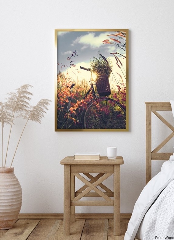 Na pierwszym planie piękna łąka kwietna, obszerna, wypełniająca połowę zdjęcia. Widoczne kwiaty w kolorach: pomarańczowy, fioletowy, czerwony, widoczna trawa. Dalej, na horyzoncie wzniesienia, sąsiadujące z niebem w kolorach – różowy, jasnoniebieski i biały. Harmonijne zdjęcie, wyciszające z pięknym widokiem na polną roślinność. Dobrze będzie się prezentować w hotelu i restauracji. Sprawdzi się w salonie i kuchni. Zdjęcie oprawione w ramę złotą, matową, wysoką.