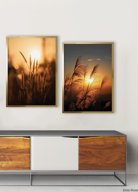 Na pierwszym planie widoczne delikatne rośliny. Z lewej strony długie, drobne łodyżki, przechylone w prawo. Na ich tle przebijające się zachodzące słońce. Ta część nieba w kolorach: żółty i pomarańczowy. Wyżej widoczne niebo – niebieskie z małymi chmurkami. Całość w ciepłych, stonowanych kolorach, wnoszące do każdego pomieszczenia odrobinę romantyzmu i zadumy. Idealne do salonu. Sprawdzi się w restauracji i hotelu. Rama złota, matowa, wysoka.