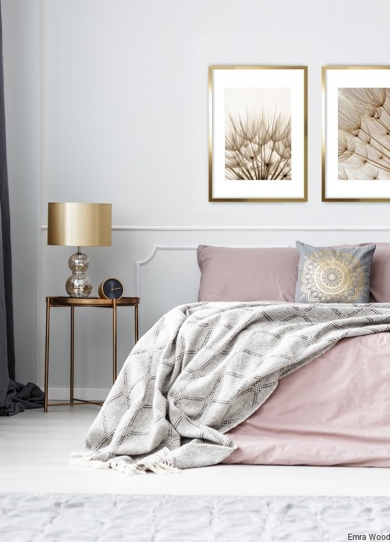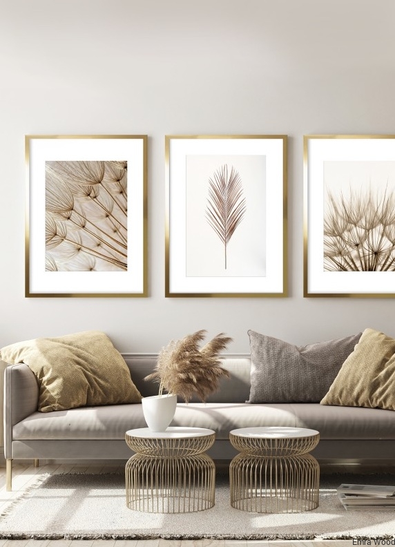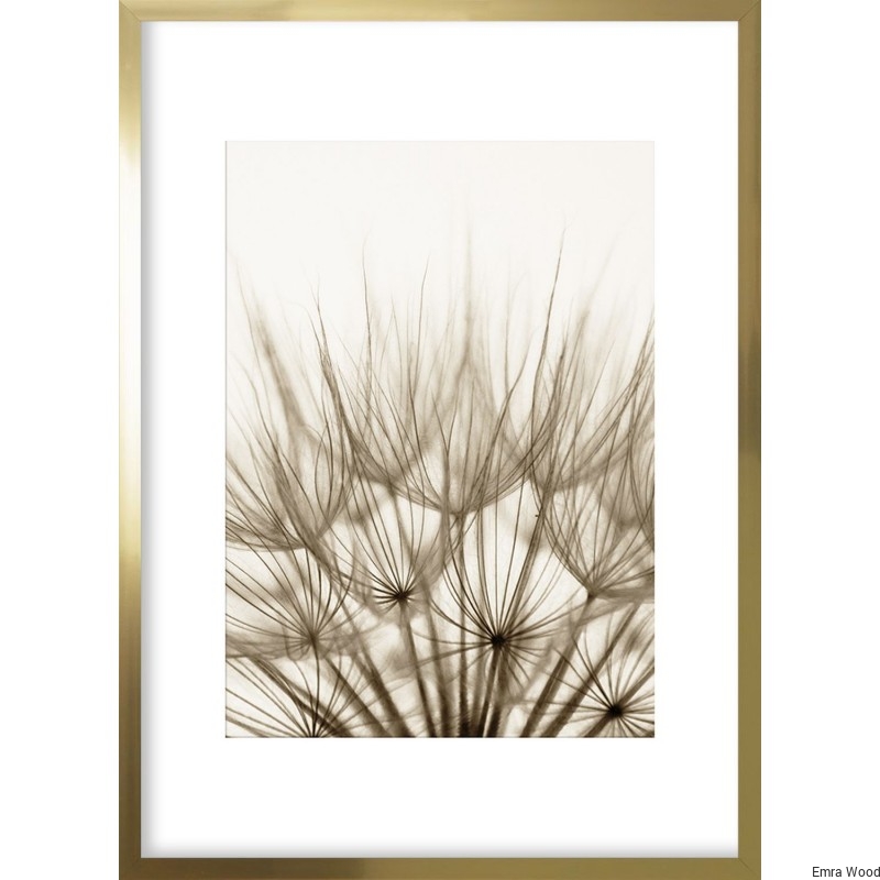Grafika z dmuchawcami w kolorze brązowym na białym tle. Grafika otoczona jest białym passe-partout. Dmuchawce ukazane są od dołu obrazu i wiodą wzrok odbiorcy ku górze. Część z nich, szczególnie te na pierwszym planie wyraźne, część rozmyta. Ten oszczędny i minimalistyczny obraz graficzny to modna propozycja do nowoczesnego wnętrza salonu, biura, hotelu czy kawiarni. Sprawdzi się w salonie urody. Oprawiona w ramę wąską, złotą.