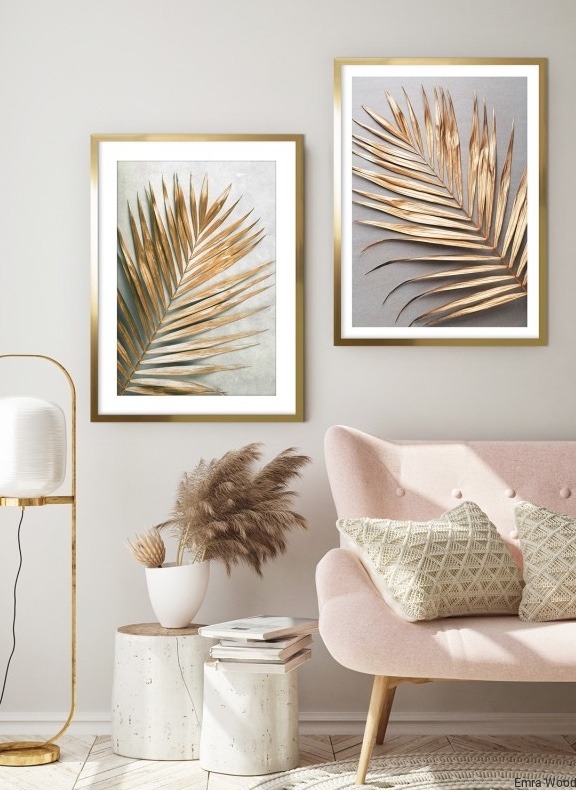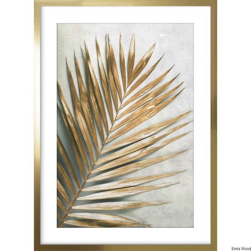Obraz wypełnia gałązka rośliny z długimi, wąskimi listkami w kolorze złotym. Gałązka wychodzi z dolnego lewego roku, pnie się w górę, na ukos. Niżej widoczne listki dłuższe, im wyżej – krótsze. Wszystkie u dołu i u góry zwężone. Całość widoczna na szarym tle. Minimalistyczny obraz z modnym, złotym kolorem listków sprawi, że wnętrze, które obraz ozdobi będzie dobrze się prezentować. Sprawdzi się w hotelu i restauracji. Obraz oprawiony w wąską, złotą i wysoką ramę.