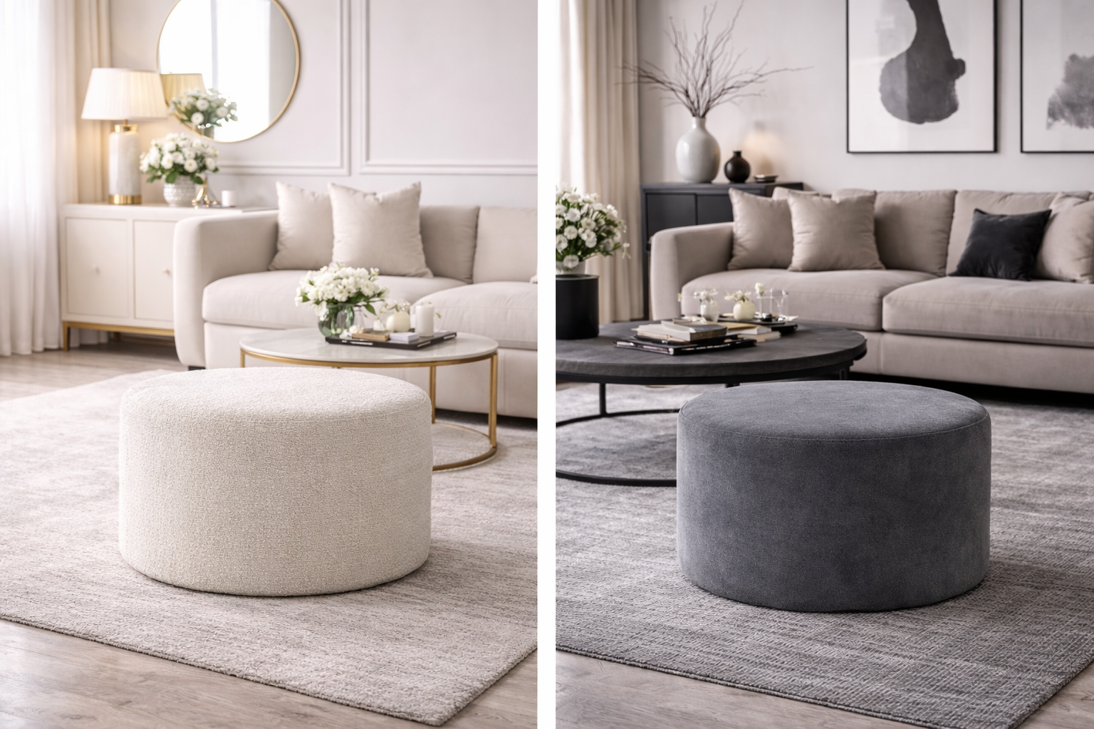 Tapicerowana pufa okrągłą jest połączeniem nowoczesnego designu i wygody, doskonale wpisuje się w nowoczesne trendy wnętrzarskie, dodając przestrzeni elegancji i stylu. Okrągłe, tapicerowane siedzisko pufy zapewnia wygodne miejsce do odpoczynku i relaksu. Wykonane z wysokiej jakości materiałów, miękkie i przyjemne w dotyku. Pufa dostępna jest w różnych wersjach kolorystycznych, co pozwala na dopasowanie jej do indywidualnego stylu i charakteru Twojej przestrzeni.