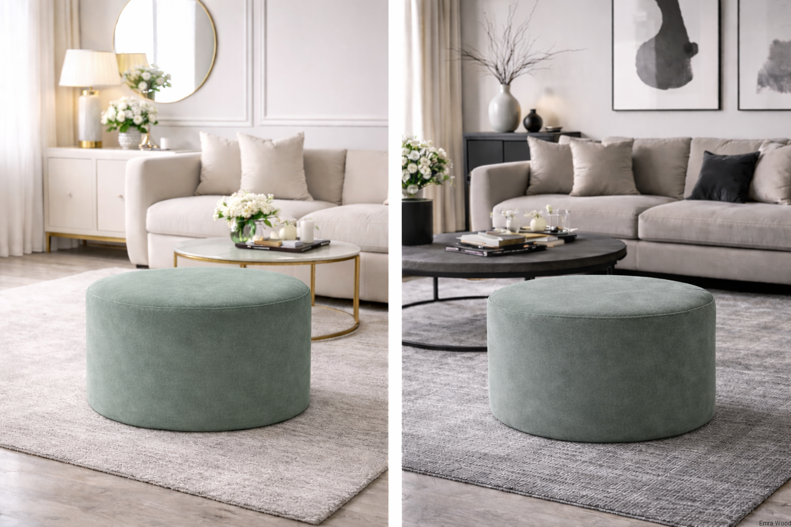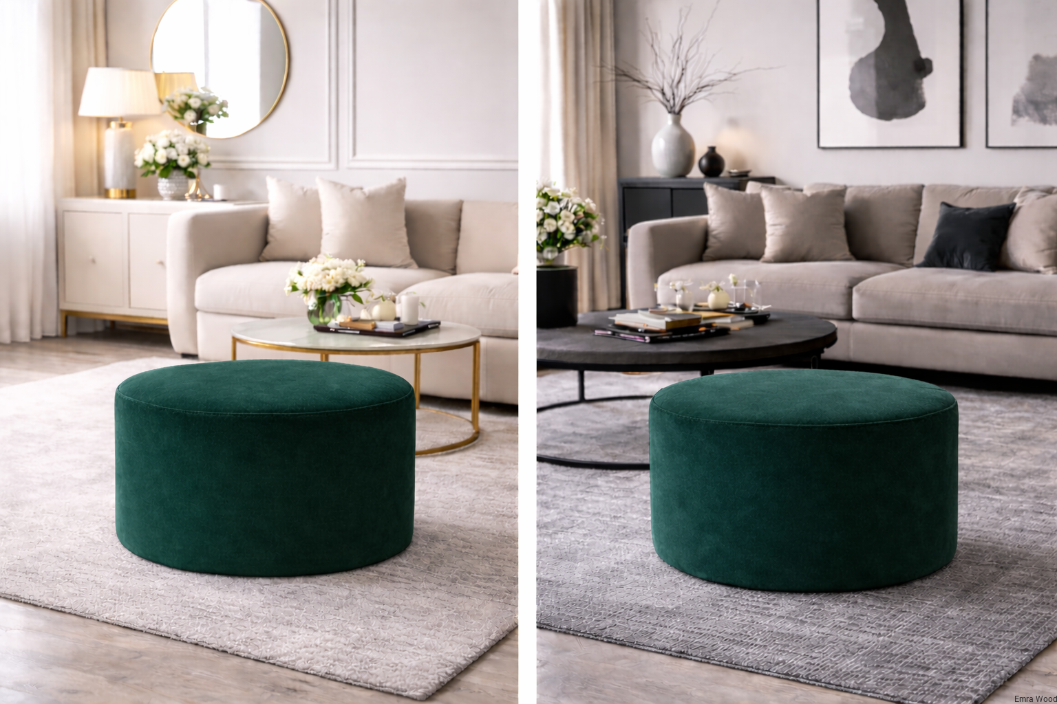 Tapicerowana pufa okrągłą jest połączeniem nowoczesnego designu i wygody, doskonale wpisuje się w nowoczesne trendy wnętrzarskie, dodając przestrzeni elegancji i stylu. Okrągłe, tapicerowane siedzisko pufy zapewnia wygodne miejsce do odpoczynku i relaksu. Wykonane z wysokiej jakości materiałów, miękkie i przyjemne w dotyku. Pufa dostępna jest w różnych wersjach kolorystycznych, co pozwala na dopasowanie jej do indywidualnego stylu i charakteru Twojej przestrzeni.