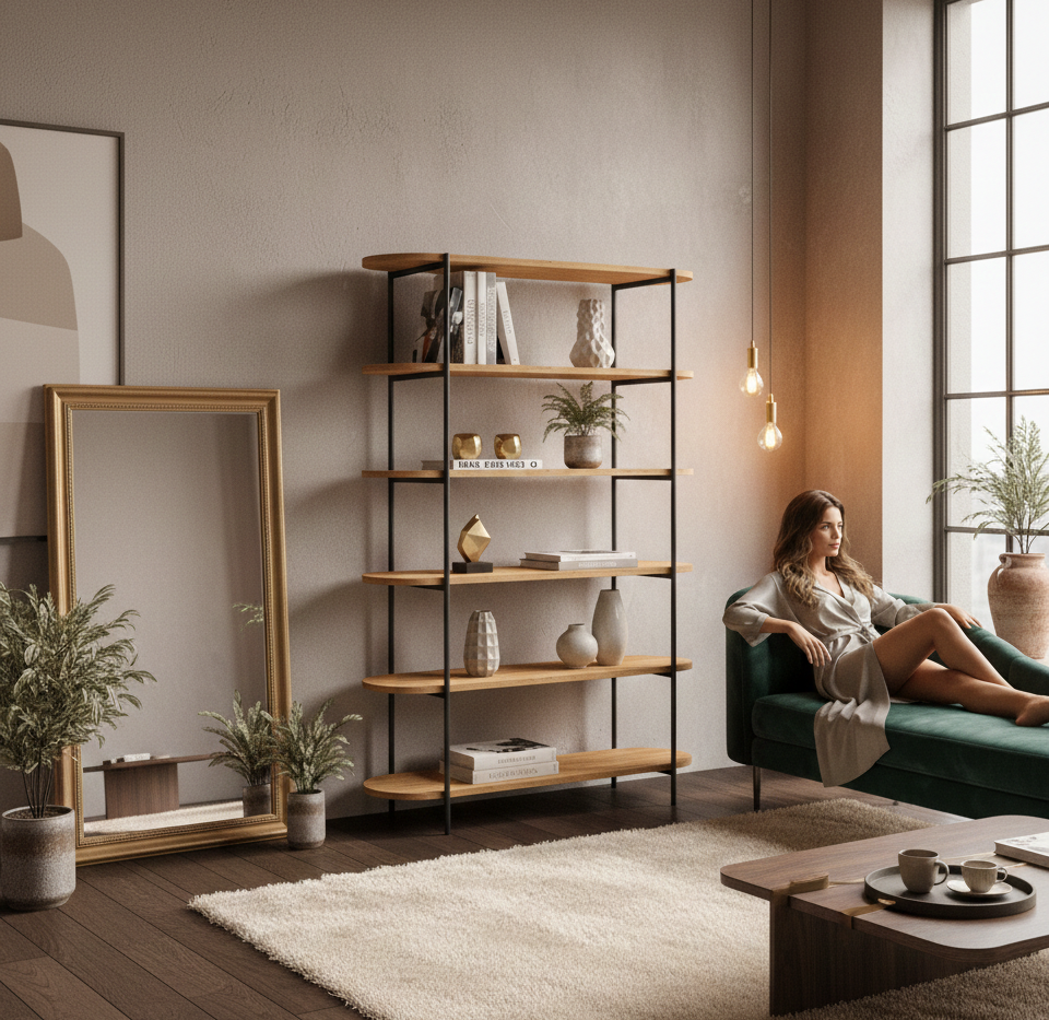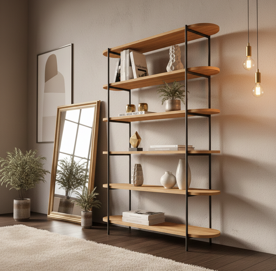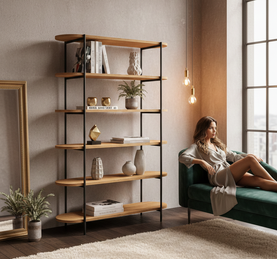 REGAŁ NA KSIĄŻKI 5 POZIOMOWY METALOWY DREWNO LITE DĄB JESION OLCHA  RNK-191