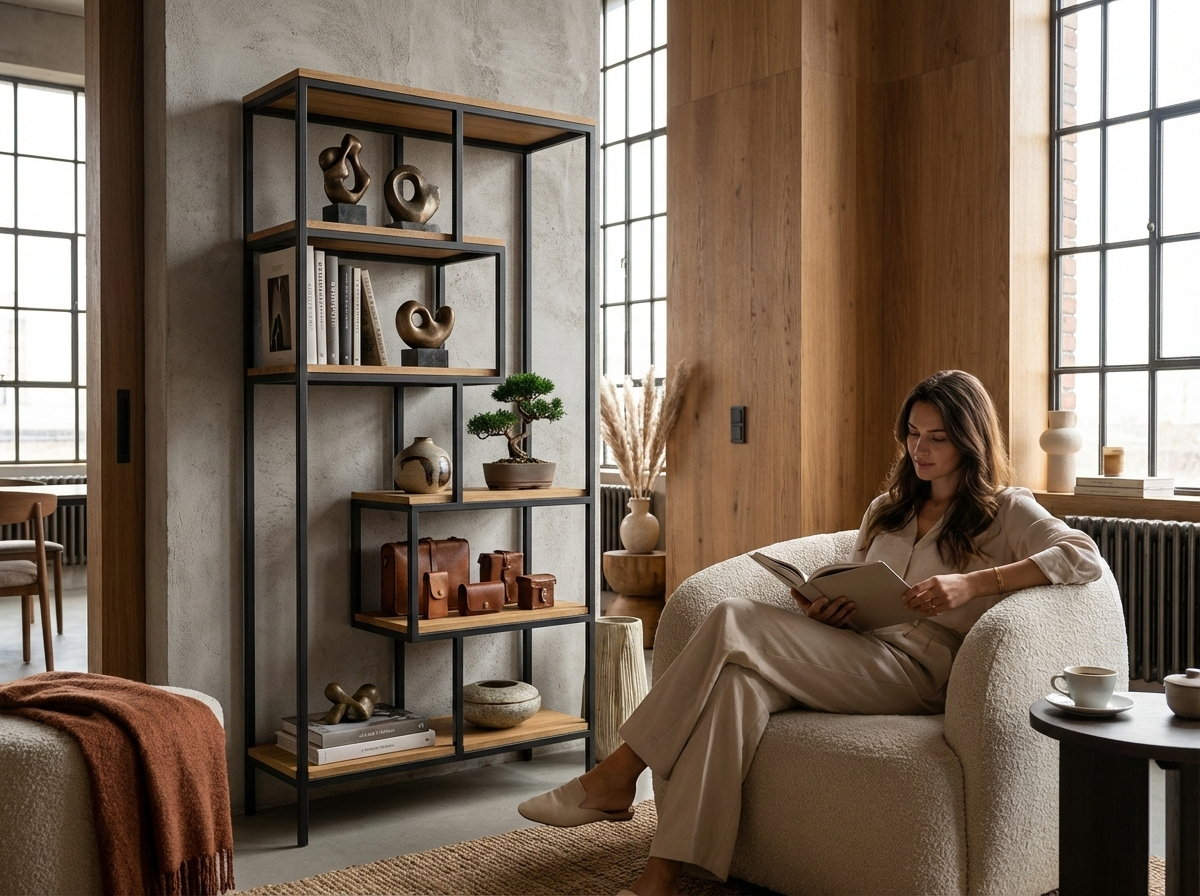 REGAŁ NA KSIĄŻKI 4 POZIOMOWY METALOWY DREWNO LITE DĄB JESION OLCHA  RNK-190