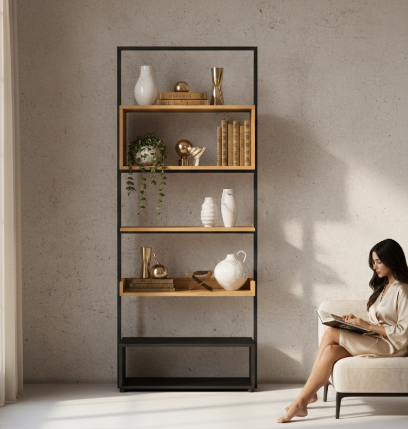 REGAŁ NA KSIĄŻKI 4 POZIOMOWY METALOWY DREWNO LITE DĄB JESION OLCHA  RNK-190
