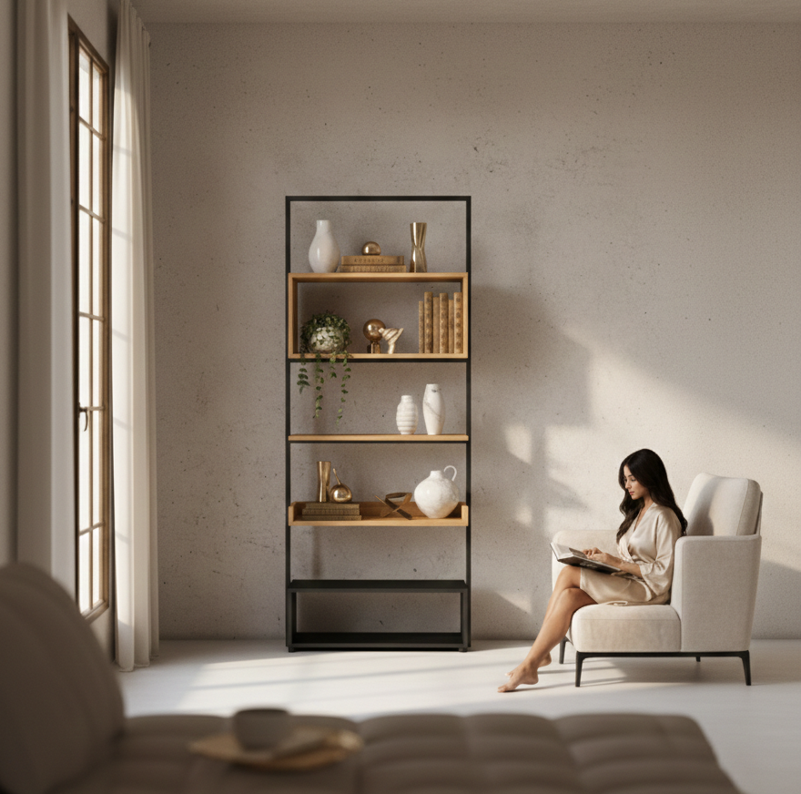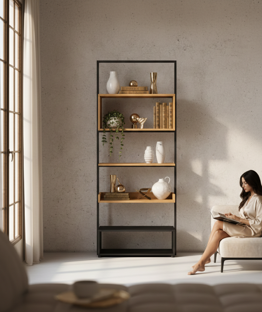 REGAŁ NA KSIĄŻKI / Stelaż Stal Kolor Czarny Drewno Olchowe Olejowane / Model RNK-124