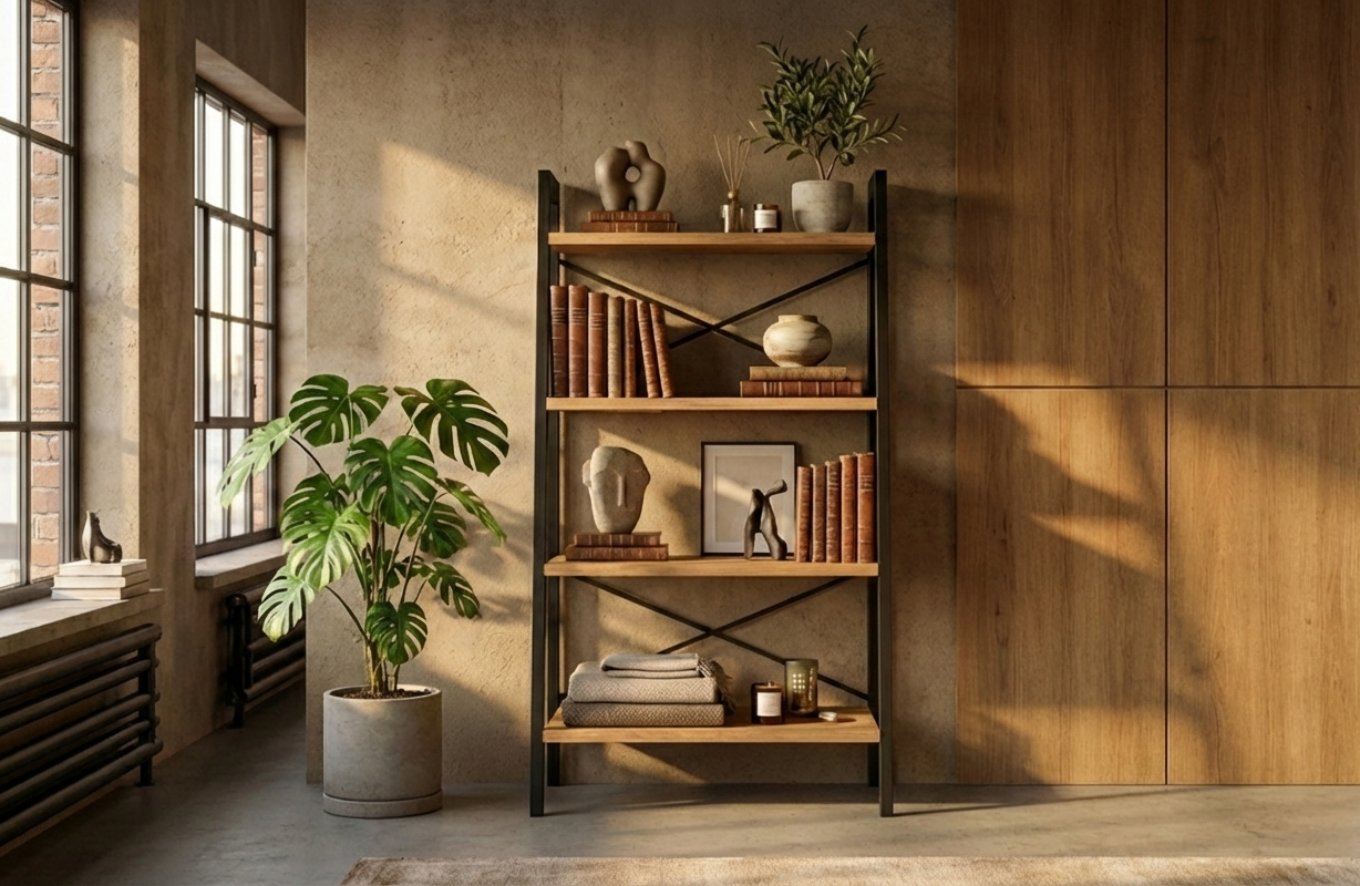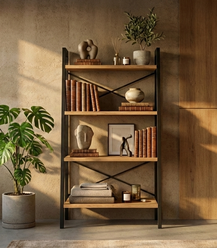 REGAŁ NA KSIĄŻKI 4 POZIOMOWY METALOWY DREWNO LITE DĄB JESION OLCHA  RNK-190