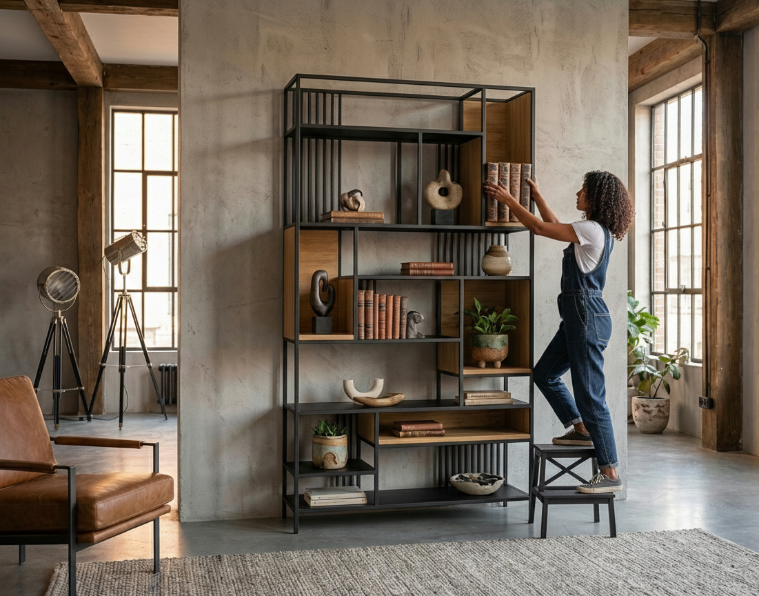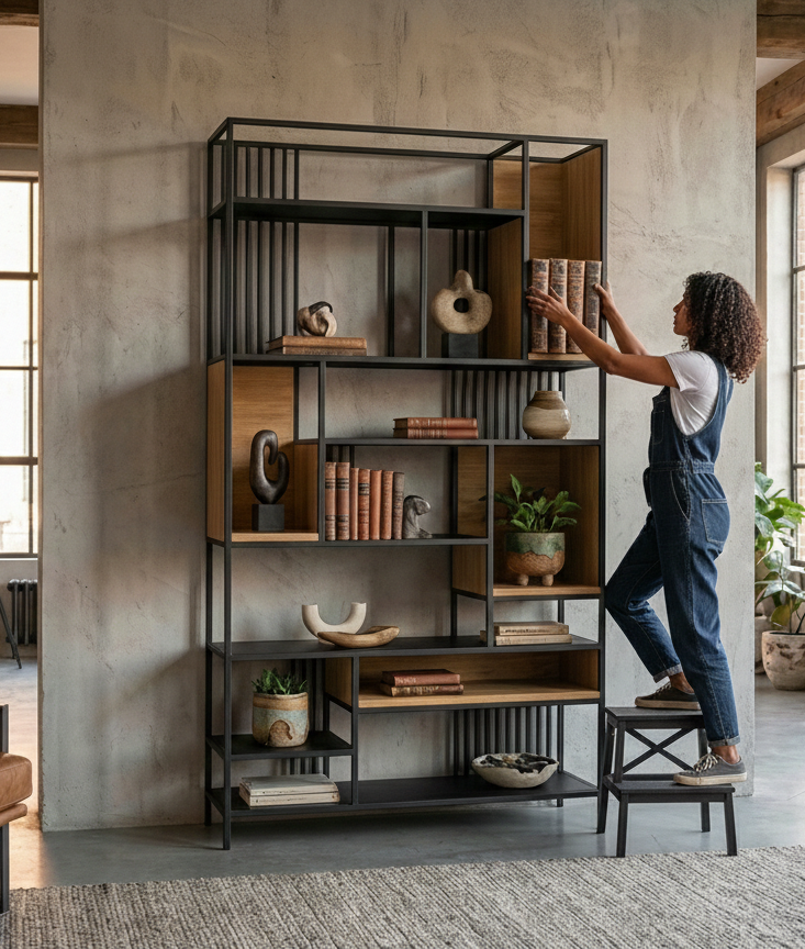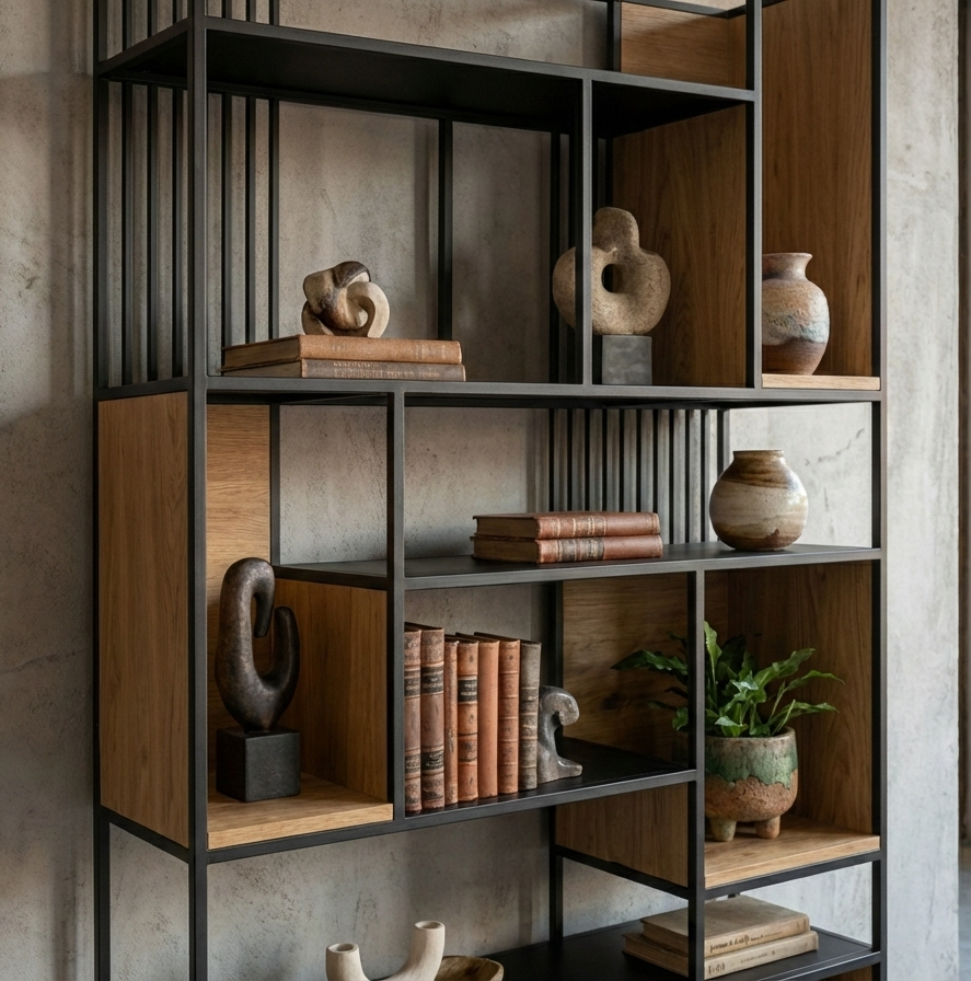 REGAŁ NA KSIĄŻKI / Stelaż Stal Kolor Czarny Drewno Olchowe Olejowane / Model RNK-142