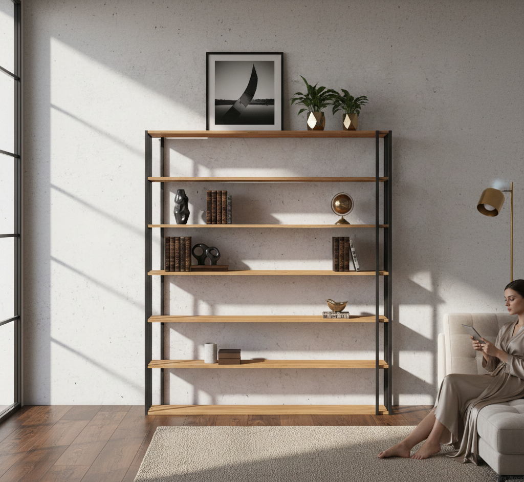 REGAŁ NA KSIĄŻKI 6 POZIOMOWY METALOWY DREWNO LITE DĄB JESION OLCHA  RNK-192
