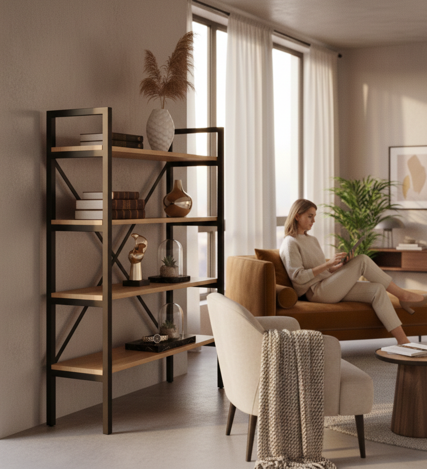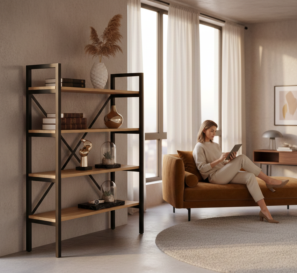REGAŁ NA KSIĄŻKI 4 POZIOMOWY METALOWY DREWNO LITE DĄB JESION OLCHA  RNK-190