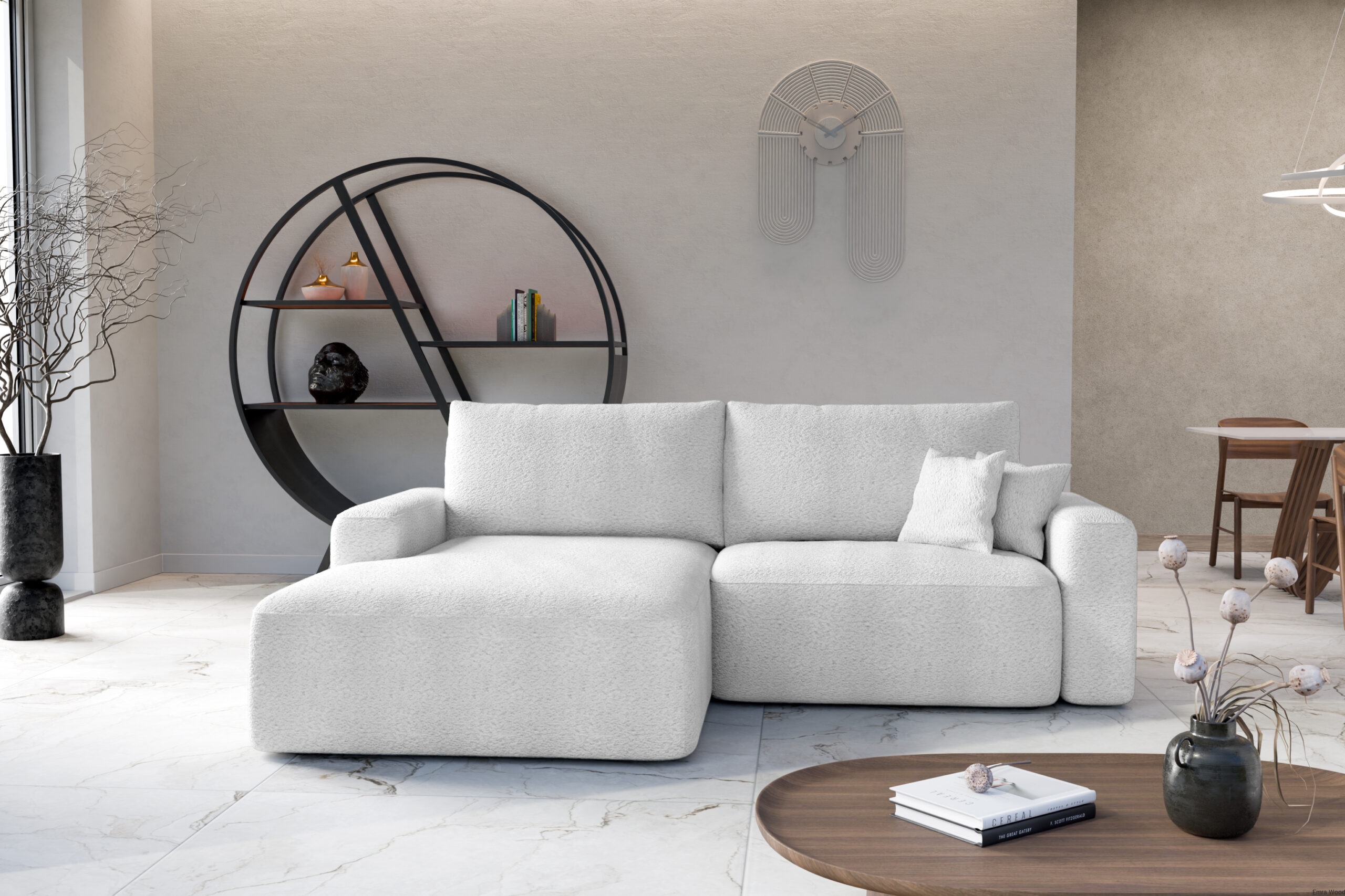 Narożnik wypoczynkowy Soho idealnie komponuje się w nowoczesnych, minimalistycznych i skandynawskich wnętrzach. Doskonale wygląda w zestawieniu z jasnymi ścianami, drewnianą podłogą i subtelnymi dodatkami, takimi jak poduszki dekoracyjne czy pledy. W większych salonach można go zestawić z dużą ławą i dywanem, tworząc przytulną strefę wypoczynkową. W mniejszych pomieszczeniach narożnik wprowadza funkcjonalność i komfort bez przytłaczania przestrzeni.
