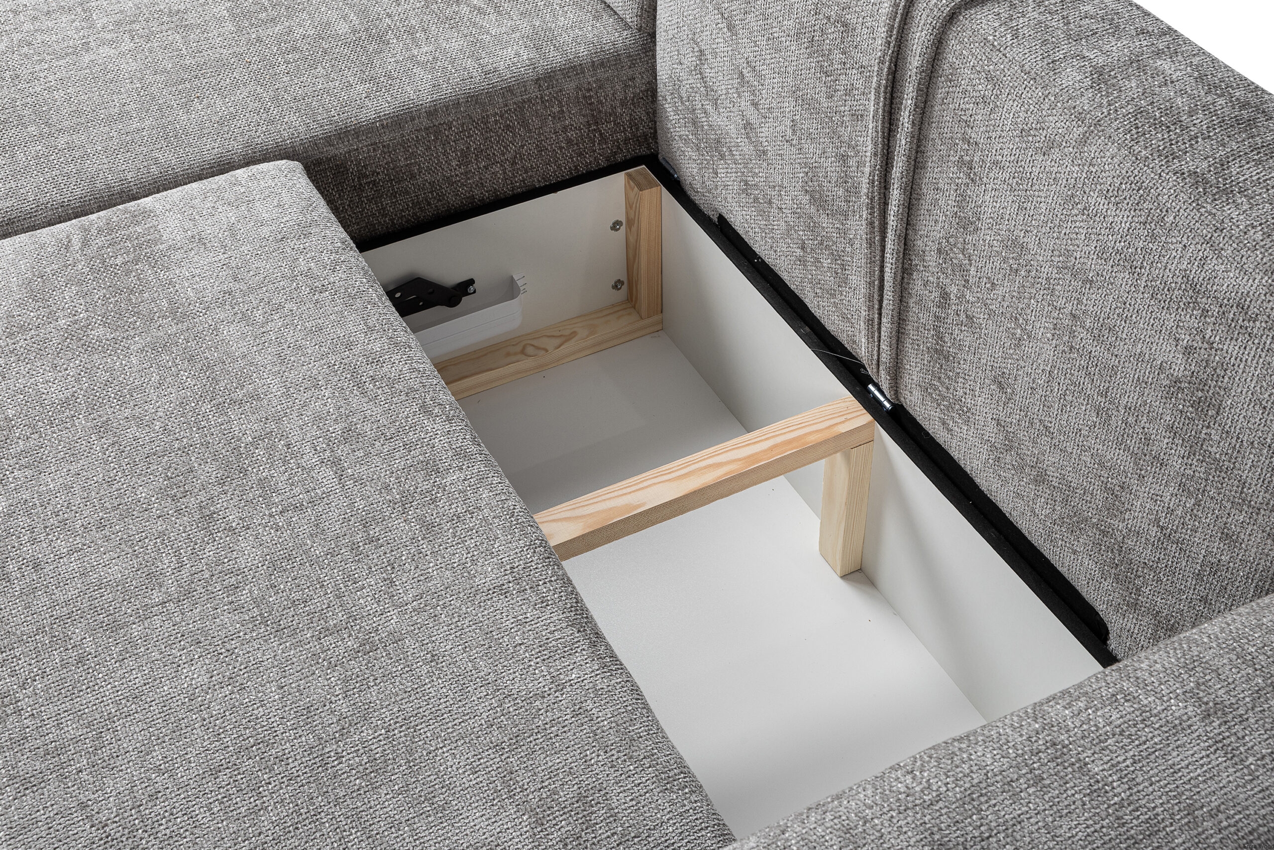 Dodatkowo narożnik Soho został wyposażony w pojemnik na pościel, który pozwala przechowywać koce, poduszki czy pościel w jednym miejscu. To praktyczne rozwiązanie pozwala utrzymać porządek w salonie i maksymalnie wykorzystać dostępną przestrzeń, co jest szczególnie ważne w mniejszych pomieszczeniach. Dzięki pojemnikowi wszystkie niezbędne tekstylia są zawsze pod ręką, a wnętrze wygląda schludnie i elegancko.