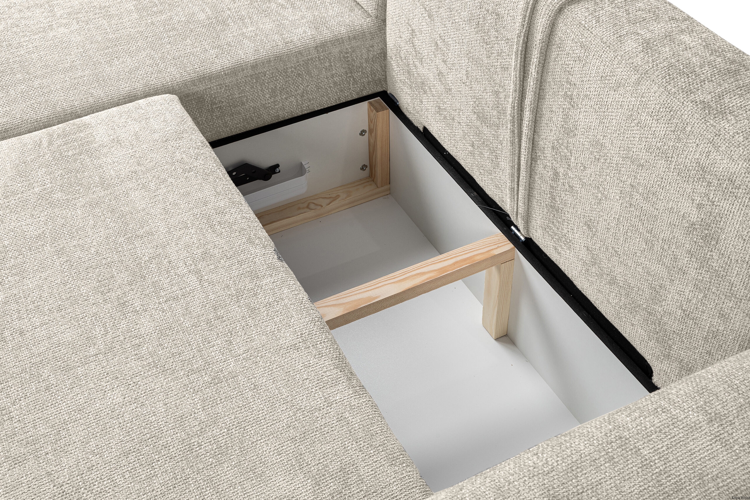 Dodatkowo narożnik Soho został wyposażony w pojemnik na pościel, który pozwala przechowywać koce, poduszki czy pościel w jednym miejscu. To praktyczne rozwiązanie pozwala utrzymać porządek w salonie i maksymalnie wykorzystać dostępną przestrzeń, co jest szczególnie ważne w mniejszych pomieszczeniach. Dzięki pojemnikowi wszystkie niezbędne tekstylia są zawsze pod ręką, a wnętrze wygląda schludnie i elegancko.