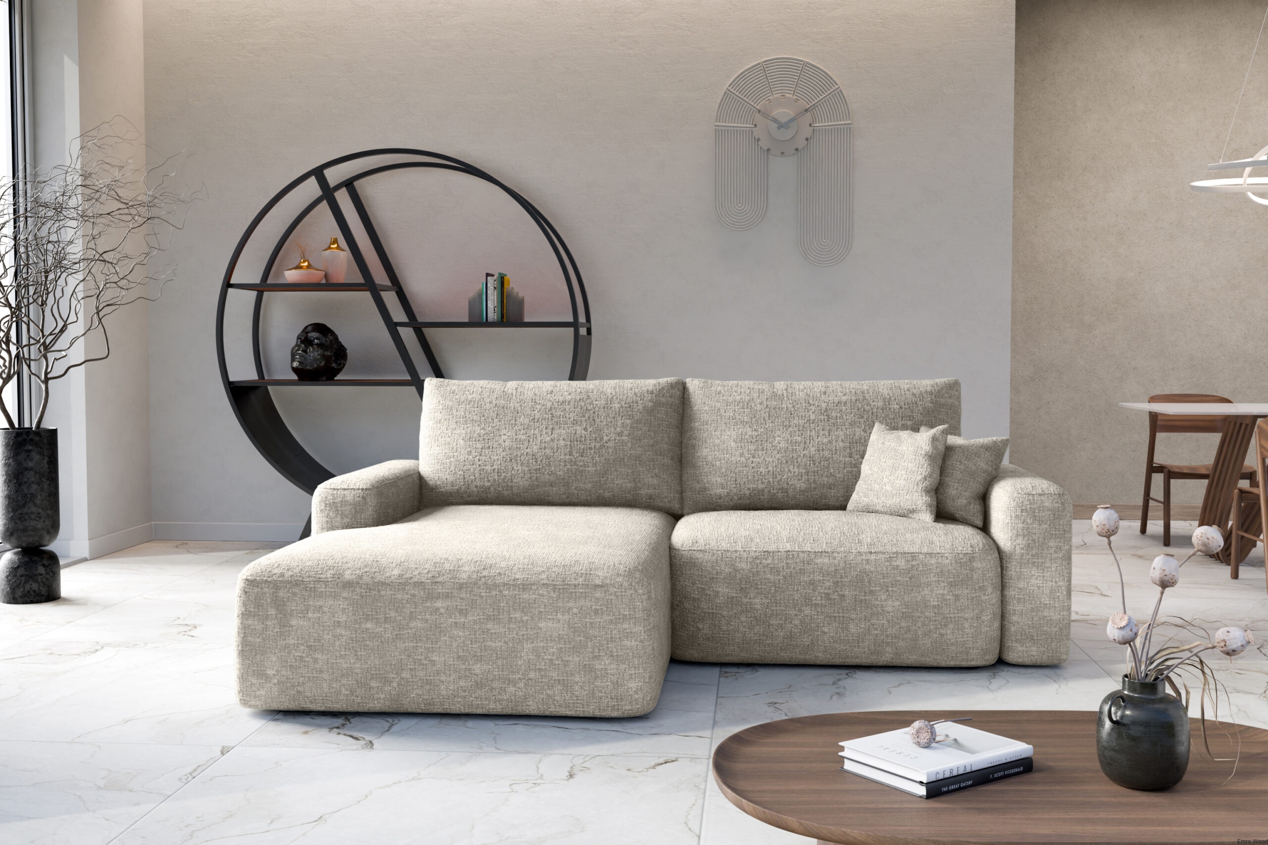 Narożnik wypoczynkowy Soho idealnie komponuje się w nowoczesnych, minimalistycznych i skandynawskich wnętrzach. Doskonale wygląda w zestawieniu z jasnymi ścianami, drewnianą podłogą i subtelnymi dodatkami, takimi jak poduszki dekoracyjne czy pledy. W większych salonach można go zestawić z dużą ławą i dywanem, tworząc przytulną strefę wypoczynkową. W mniejszych pomieszczeniach narożnik wprowadza funkcjonalność i komfort bez przytłaczania przestrzeni.