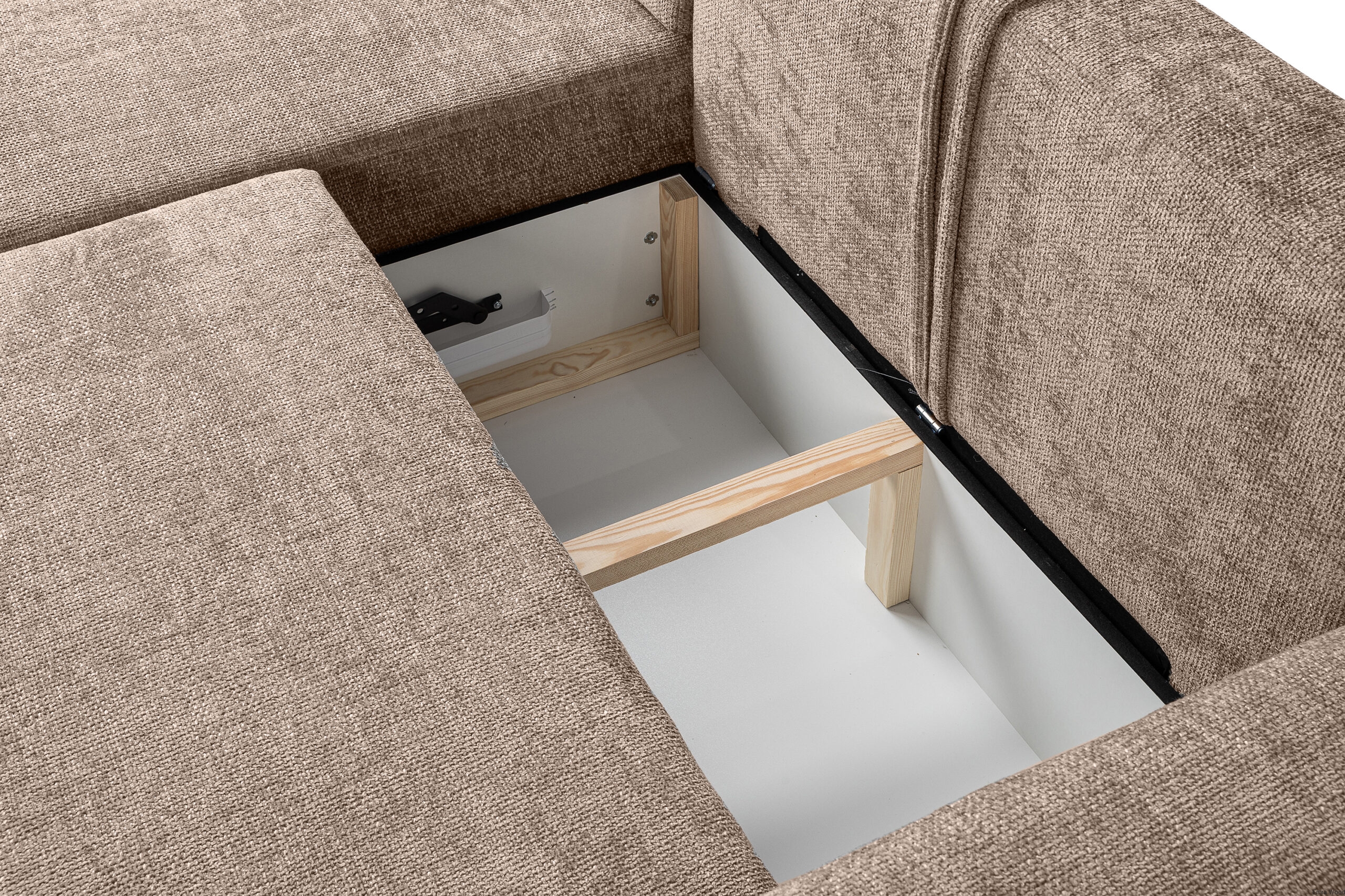 Dodatkowo narożnik Soho został wyposażony w pojemnik na pościel, który pozwala przechowywać koce, poduszki czy pościel w jednym miejscu. To praktyczne rozwiązanie pozwala utrzymać porządek w salonie i maksymalnie wykorzystać dostępną przestrzeń, co jest szczególnie ważne w mniejszych pomieszczeniach. Dzięki pojemnikowi wszystkie niezbędne tekstylia są zawsze pod ręką, a wnętrze wygląda schludnie i elegancko.