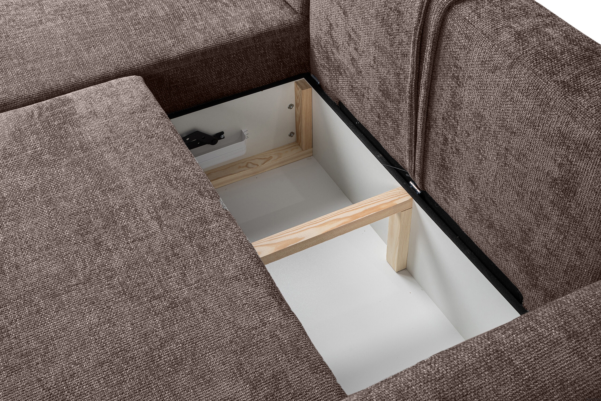 Dodatkowo narożnik Soho został wyposażony w pojemnik na pościel, który pozwala przechowywać koce, poduszki czy pościel w jednym miejscu. To praktyczne rozwiązanie pozwala utrzymać porządek w salonie i maksymalnie wykorzystać dostępną przestrzeń, co jest szczególnie ważne w mniejszych pomieszczeniach. Dzięki pojemnikowi wszystkie niezbędne tekstylia są zawsze pod ręką, a wnętrze wygląda schludnie i elegancko.