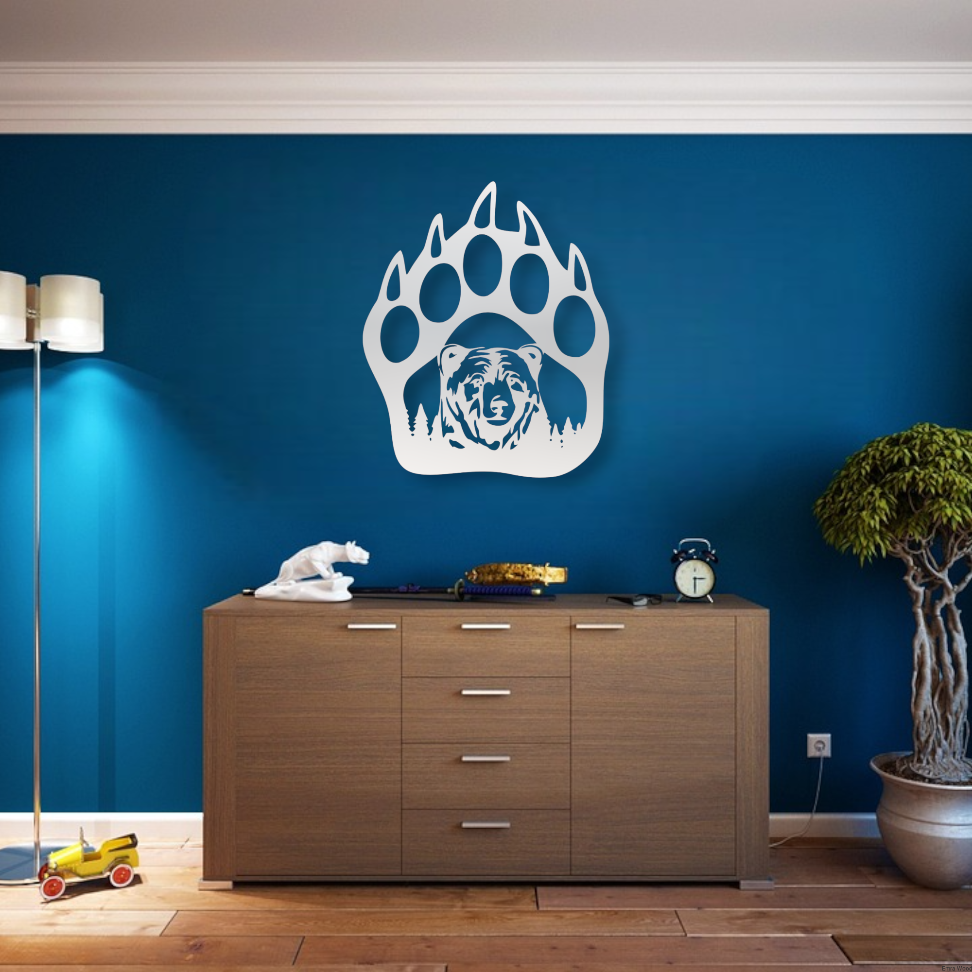 • Sylwetka Niedźwiedzia: Centralnym motywem dekoracji jest wyraźna i minimalistyczna sylwetka niedźwiedzia. To zwierzę symbolizuje siłę, dzikość i harmonię z przyrodą.