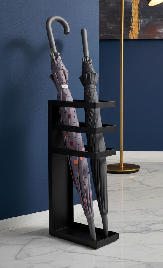Nowoczesny i stylowy stojak na parasole RINN doskonale wpasowuje się w różne style wnętrzarskie, dodając im nowoczesnego i eleganckiego charakteru. Jego minimalistyczny design i starannie wykonana konstrukcja sprawiają, że stojak jest nie tylko praktycznym, ale również estetycznym elementem dekoracyjnym. Metalowa konstrukcja, malowana metodą proszkową, jest odporna na uszkodzenia, odpryski, a także działanie czynników atmosferycznych, takich jak wilgoć czy promieniowanie UV. Metalowy stojak na parasole RINN sprawi, że Twój hol, wejście czy recepcja będą zawsze schludne i zorganizowane. Nie musisz już martwić się, gdzie zostawić mokre parasole, ponieważ stojak RINN zapewni im odpowiednie miejsce do suszenia.